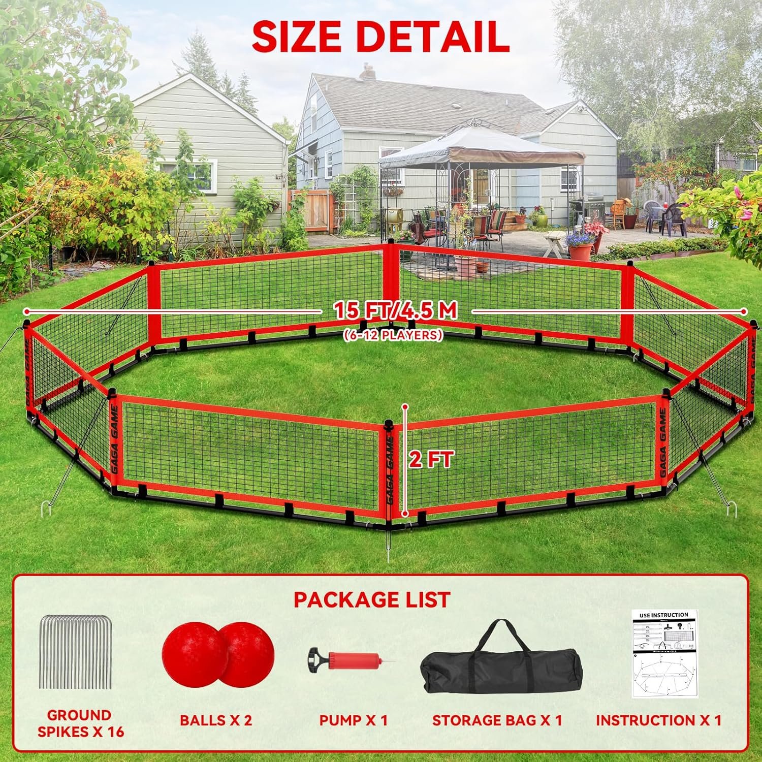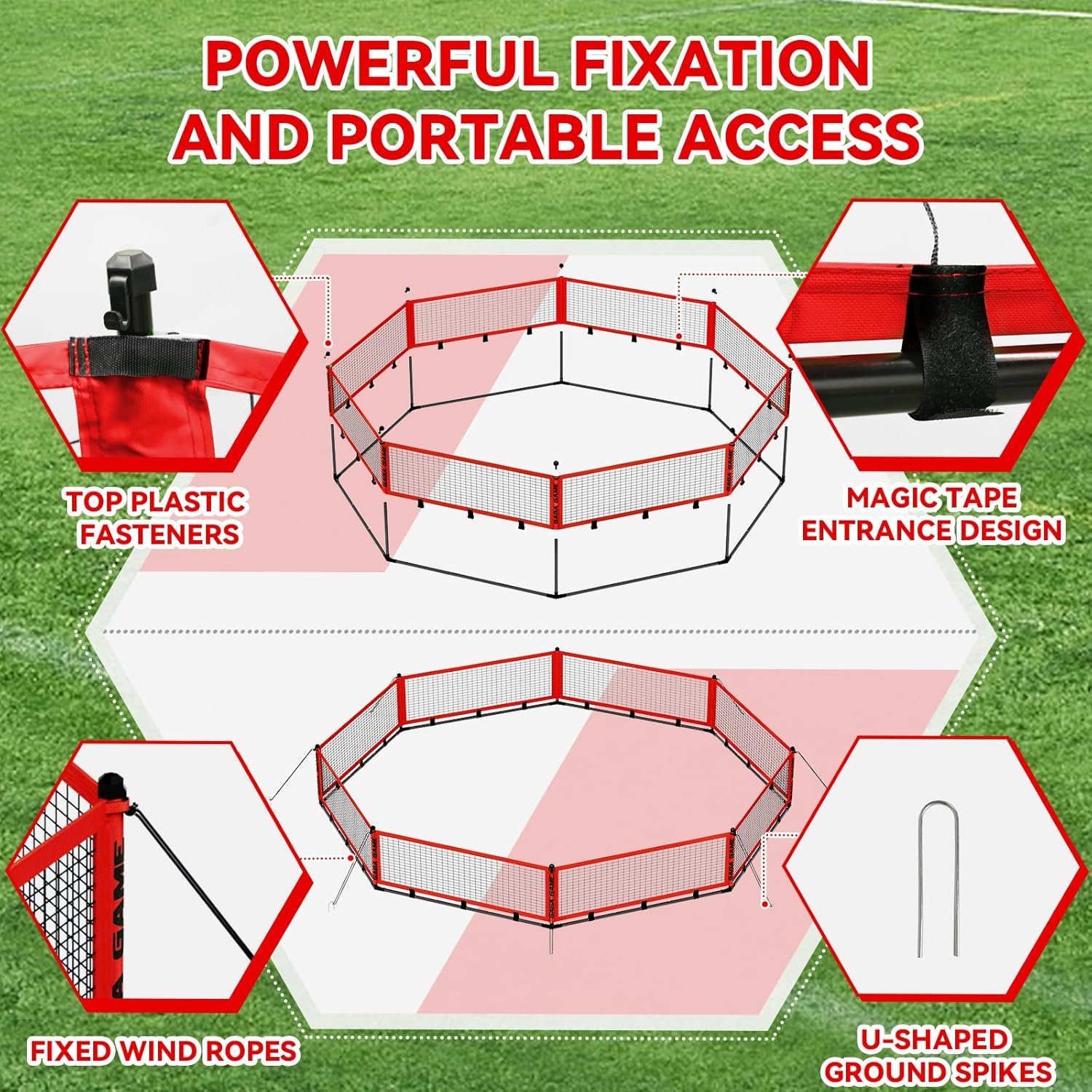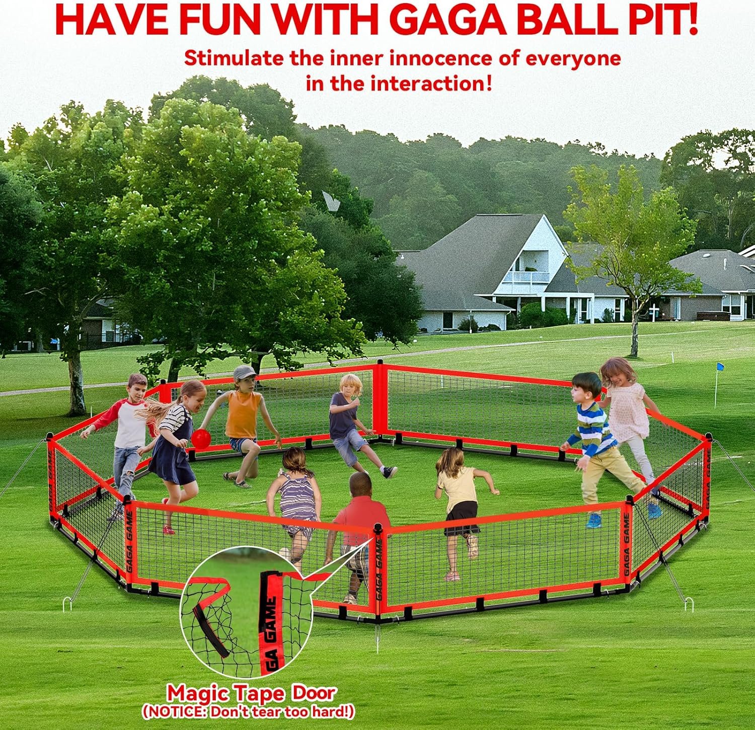 The portable gaga ball pit is made from durable, wear-resistant mesh and 600D Oxford fabric, ensuring longevity. It features multiple fixing solutions, including wind ropes and ground spikes, for enhanced stability. Easy to install and lightweight, it assembles in five minutes and comes with a carry bag for convenient storage. The pit’s entrance is designed for easy access while preventing balls from escaping. Suitable for all ages, it promotes teamwork and agility, making it ideal for outdoor events, camping, and gatherings. The set includes two balls for immediate play.
