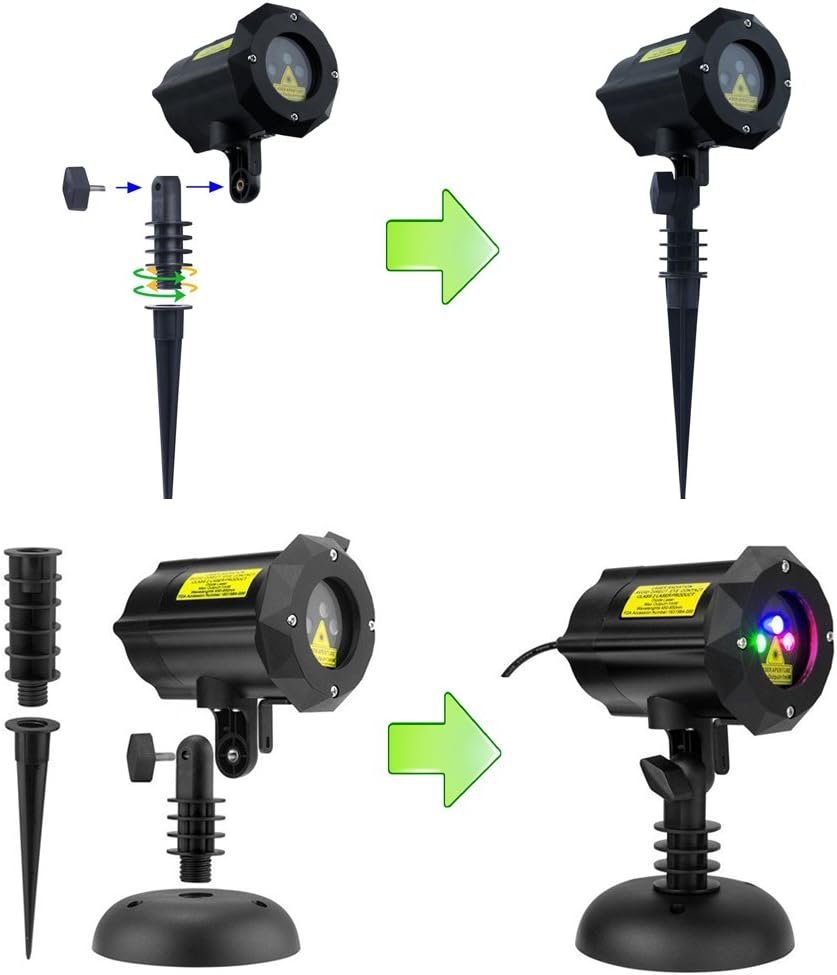 Transform your space with the Blue Green and Red Laser Projector! Easy to install with a round base and ground stake, it features a 180° adjustable head and IP65 weatherproof rating. Comes with an RF remote for customizable colors, speed, and timing. Perfect for any celebration!