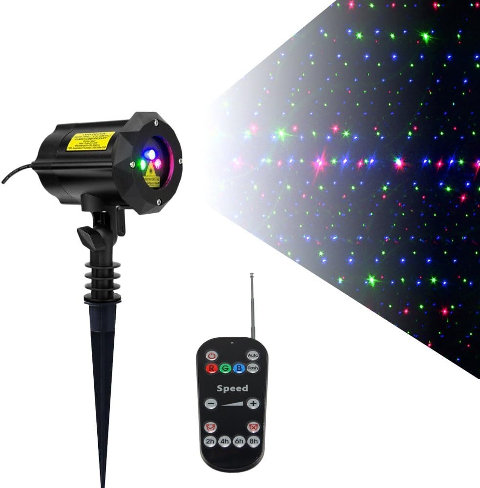 This easy-to-install laser projector features a 180° adjustable head and IP65 weatherproof rating, making it ideal for outdoor use. It projects over 1,000 colorful spots (blue, green, red) across a 50 x 50 ft area. A remote control allows users to customize lighting modes and set timers (2/4/6/8 hours ON). The unit comes with a round base and ground stake for versatile mounting options. Weighing 2.69 pounds and measuring 7.32 x 7.2 x 5.51 inches, it includes 2 AAA batteries. Ideal for various events like parties and weddings, it boasts a 4.4-star customer rating from 83 reviews.