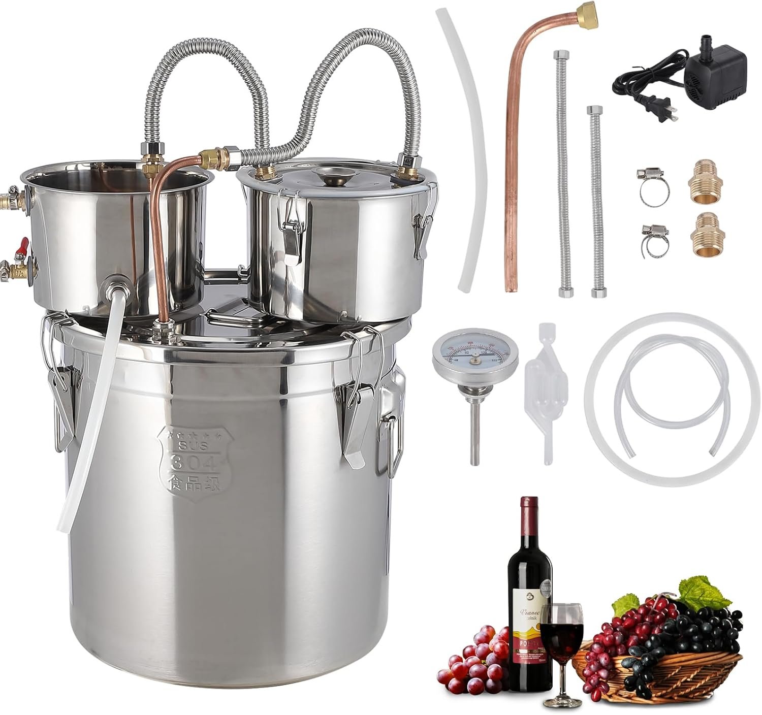 The GarveeHome Alcohol Still is a professional-grade distillery kit suitable for beginners and experienced brewers. It features double cooling efficiency with a copper coil, a water pump for optimized cooling, and a real-time thermometer for precise monitoring. Constructed with food-grade silicone, it ensures a tight seal and durability. This versatile kit can distill various beverages, including whiskey, wine, and essential oils, while supporting multiple heating methods. Complete with all necessary accessories, it enhances the home brewing experience, offering a blend of quality, usability, and efficiency for DIY enthusiasts.