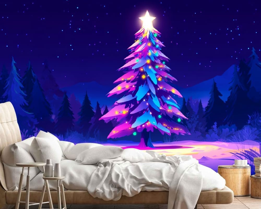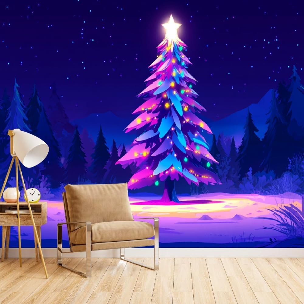 Glowing Christmas Tree Mural Wallpaper, Night Sky Peel and Stick Self-Adhesive Wall Mural for Bedroom Living Room TV Background Sofa Wall 144″ x 100″(W x H)