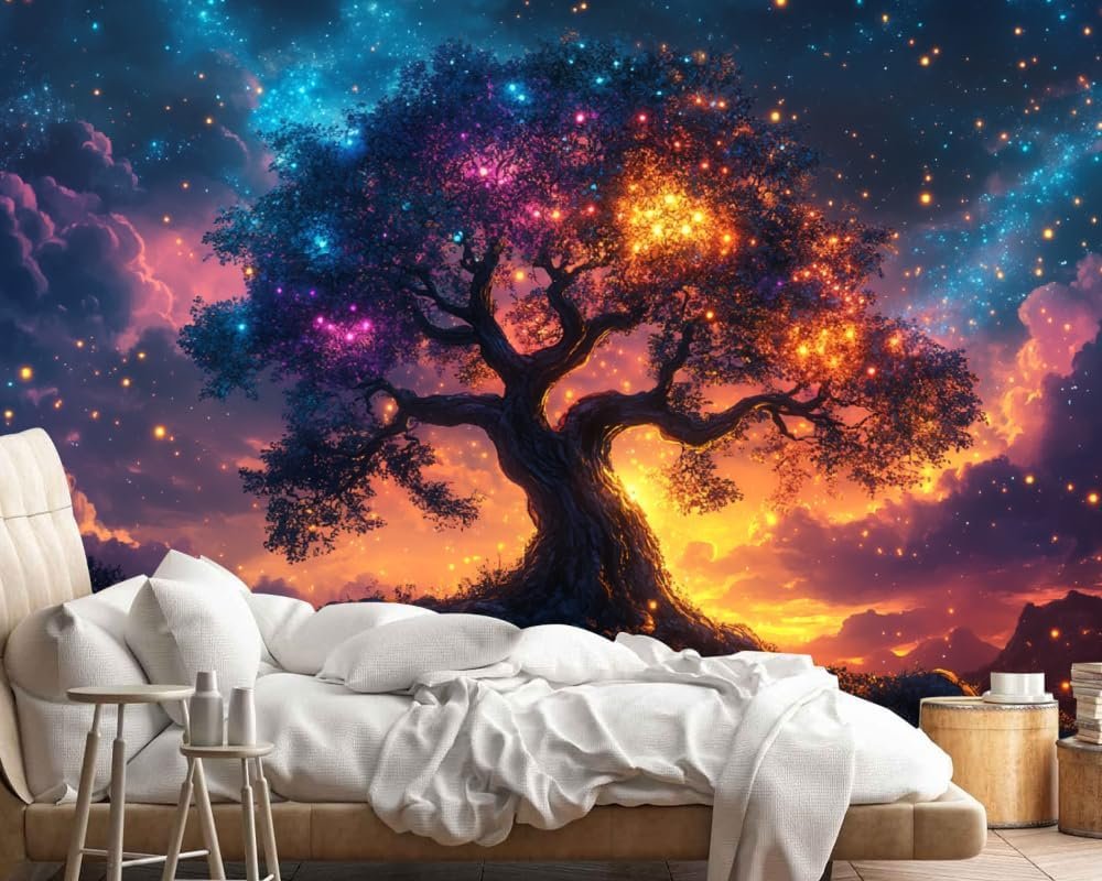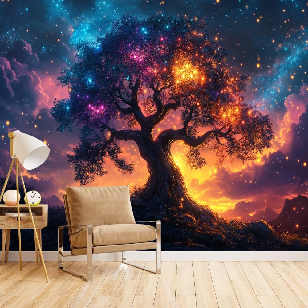 Glowing Tree Wall Mural, 3D Abstract Night Sky Peel and Stick Self-Adhesive Wallpaper, Removable Sticker Home Decor TV Background Large Art Wall Painting 144″ W x 100″ H
