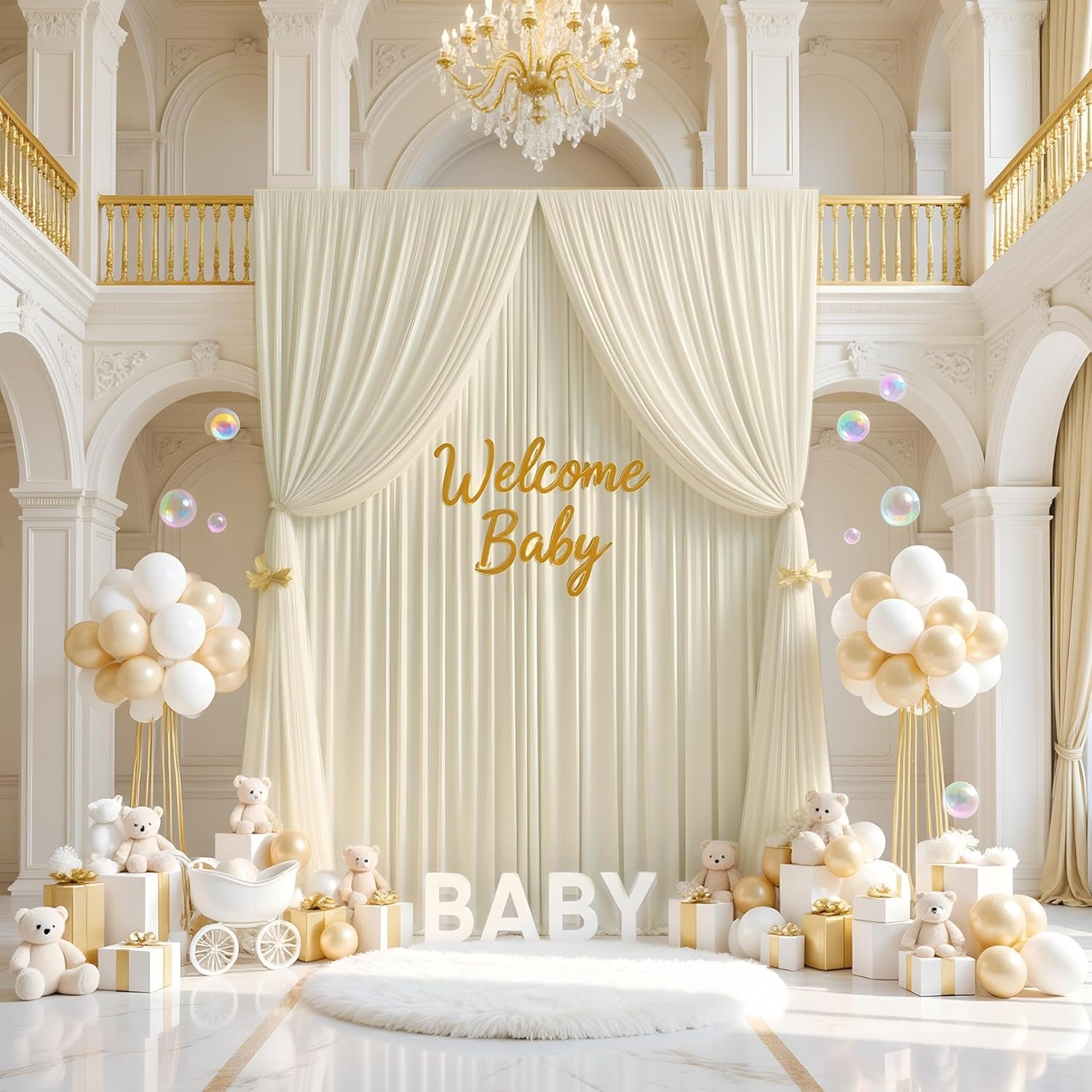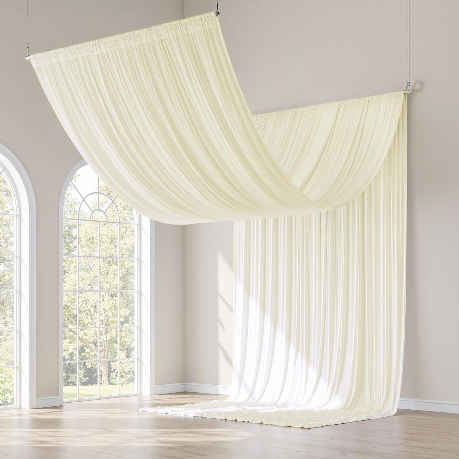 The 40x20FT Ivory Ceiling Drapes include 8 wrinkle-free panels (5x20FT each) for complete coverage, ideal for weddings, parties, and photo backdrops. Made from premium polyester, they provide a soft, elegant look with low light transmission. These versatile drapes suit various themes and can be used indoors or outdoors as canopies or room dividers. They resist wrinkles and can be reused without ironing. With a 4-inch rod pocket, they easily slide onto hooks or rods for quick installation, creating a sophisticated atmosphere effortlessly.