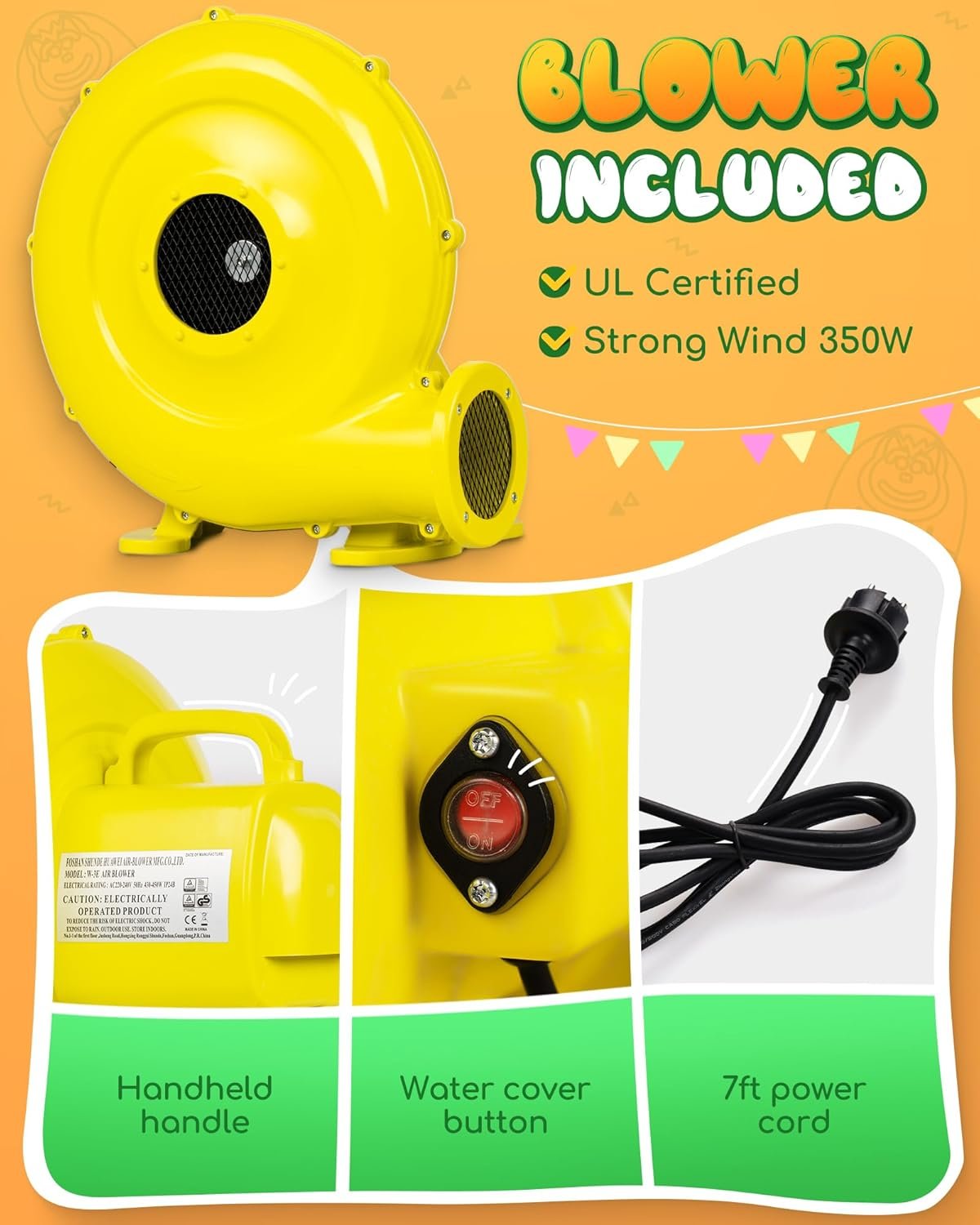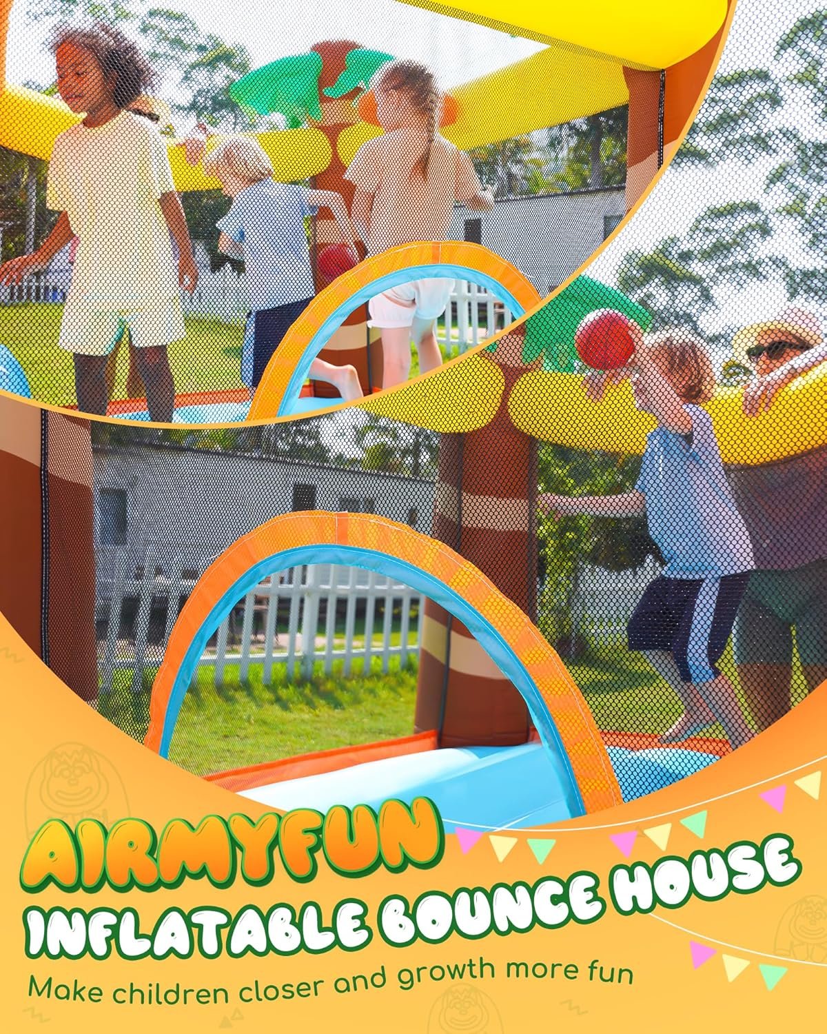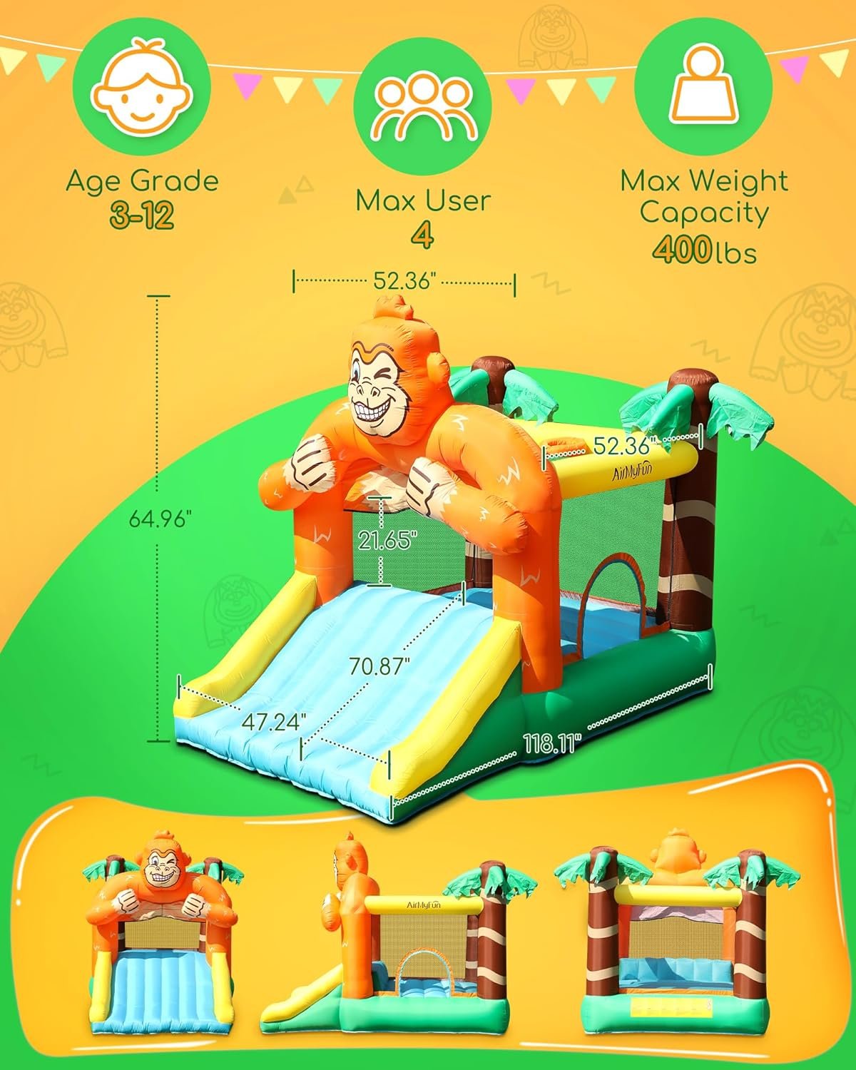 This inflatable bounce house features a fun jungle theme with a gorilla design, perfect for kids aged 3-8. It includes a spacious jumping area and slide for 2-3 children to enjoy, promoting active play. Setup takes just one minute with the included air blower, and its lightweight design allows for easy transport. Made from durable, tear-resistant 840D Oxford cloth, it ensures safety with breathable mesh sides. The package includes an air blower, repair patches, inflatable basketball, storage bag, small pump, and ground stakes, offering everything needed for an exciting play experience.