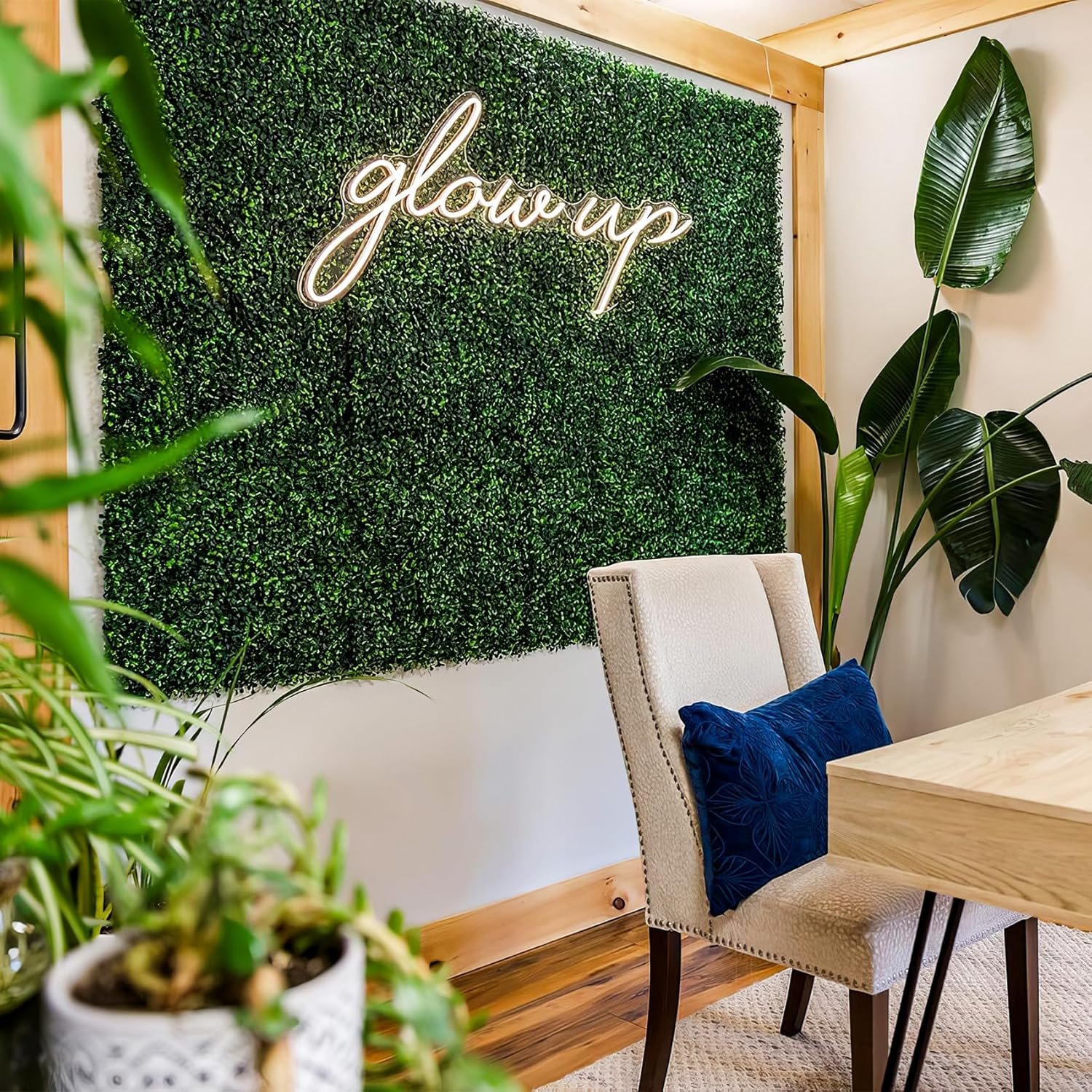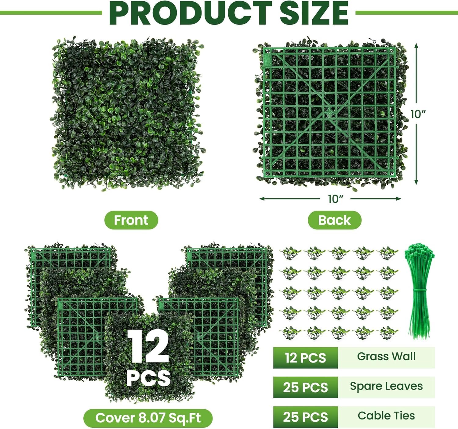 This product features ultra-realistic faux grass wall panels made from high-density polyethylene (PE), ensuring durability, weather resistance, and low maintenance. Each panel mimics natural foliage with dense clusters and vibrant colors that last without fading or withering. The easy-to-install DIY kit includes 12 panels, zip ties, and spare leaves, allowing for customizable sizes and shapes. Ideal for both indoor and outdoor use, these panels enhance privacy while providing a lush decorative touch. Lightweight and portable, they are perfect for various applications, from home decor to outdoor privacy screens.