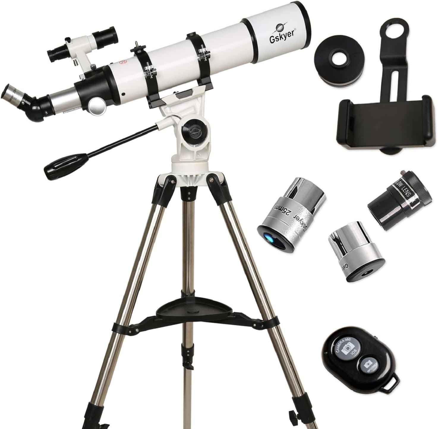 The Gskyer 90mm Astronomical Refractor Telescope features a 90mm aperture and 600mm focal length, ideal for observing celestial and terrestrial objects. It includes coated optical components for clear views, three interchangeable eyepieces (24X, 60X, 120X), and a 3X Barlow lens for enhanced magnification. The adjustable aluminum tripod ranges from 31.5 to 49 inches, making it user-friendly for beginners. The company offers a refund policy and encourages customer feedback for improved service. Gskyer has over 20 years in the optical industry, utilizing advanced technology for a range of users.