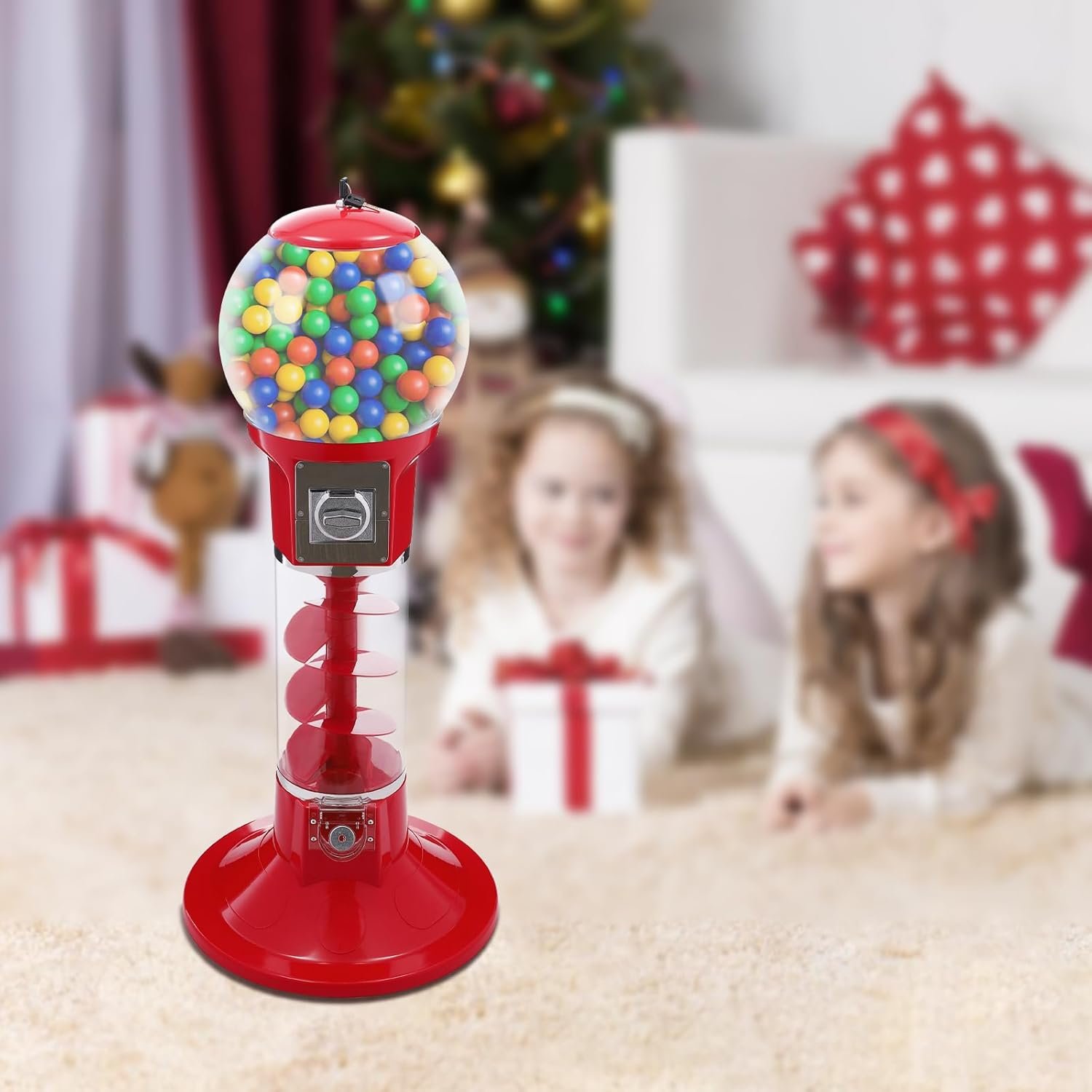 This vending machine features a rotating movement for easy visibility of items, along with rounded edges for safety. Made from durable ABS, PC, and zinc alloy, it holds 300 twister balls or 800 smaller balls and supports a load of 11.02 lbs. The clear and red design appeals to children, while its compact size saves space. It operates with a one-dollar coin, ensuring effortless use. The machine includes a lock for security and comes with four keys. Overall, it’s ideal for retail locations and amusement parks, providing a fun and secure experience.