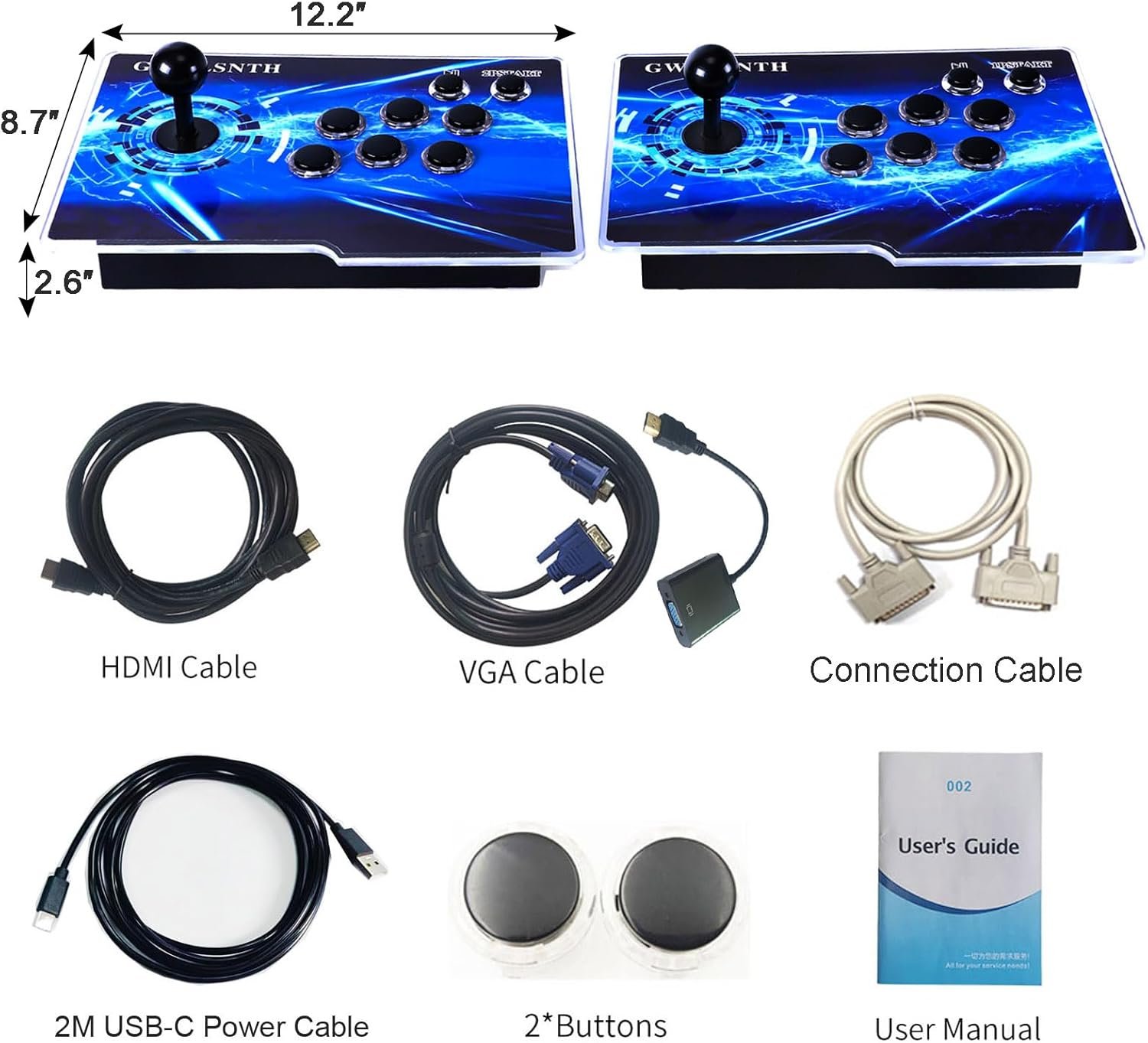The GWALSNTH Pandora Box Arcade Ultra features a 256GB TF Card with 50,500 preloaded games and 49 built-in emulators. It connects to various devices like TVs, PCs, and consoles, offering HD video and audio output at 1280x720P. The system supports 1-4 players, includes game search and classification functions, and has customizable controls. The package includes two consoles, cables, and replacement buttons. With its low power consumption, cooling fan, and colorful acrylic panel, it provides a versatile gaming experience. Ideal for arcade, sports, and puzzle games, it’s simple to set up and use.