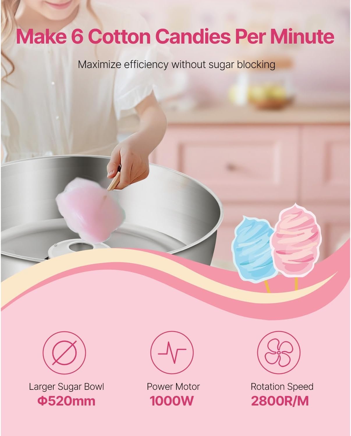 The Happybuy cotton candy machine features a 3.7-ounce candy bowl made of stainless steel, with dimensions of 20.47×20.47×17.59 inches and a weight of 16.53 lbs. It has a power rating of 1000W and yields up to 6 cotton candy cones per minute. Designed for user-friendliness, it includes a candy box and sugar scoop, preventing sugar spillage. It accommodates various candy types and ensures precise temperature control, adjustable between 244.9°F and 439.2°F. Ideal for events, it’s easy to operate, allowing beginners to produce perfect cotton candy quickly.