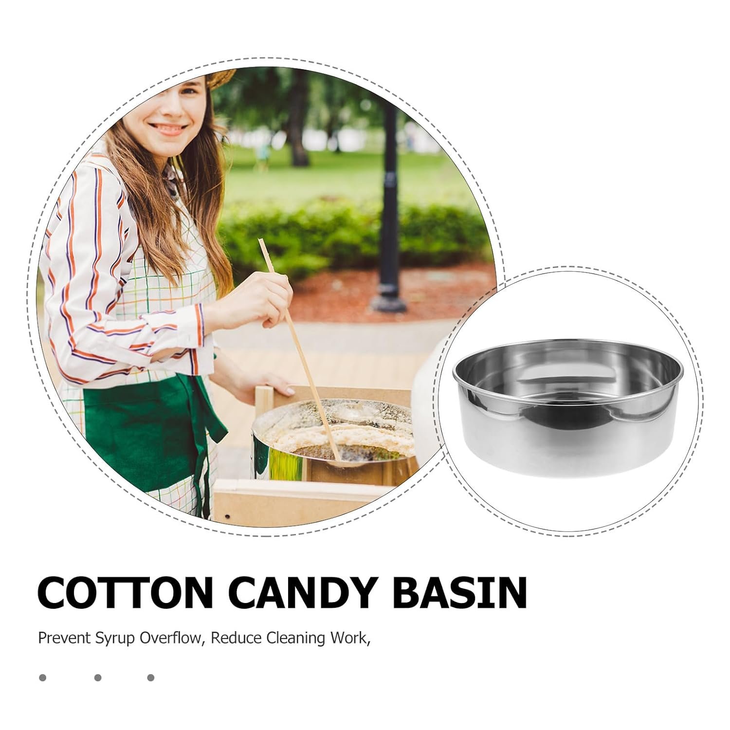 This stainless steel cotton candy machine accessory features a sleek, round design for efficient candy production. Its polished surface allows for easy cleaning and is suitable for both commercial and home use. Key features include high-temperature resistance, seamless edges to prevent overflow, and universal compatibility with various cotton candy machines. With dimensions of 14.96 x 14.96 x 4.72 inches, it enhances production speed and reduces cleanup time, making it an ideal choice for anyone looking to elevate their cotton candy-making experience.