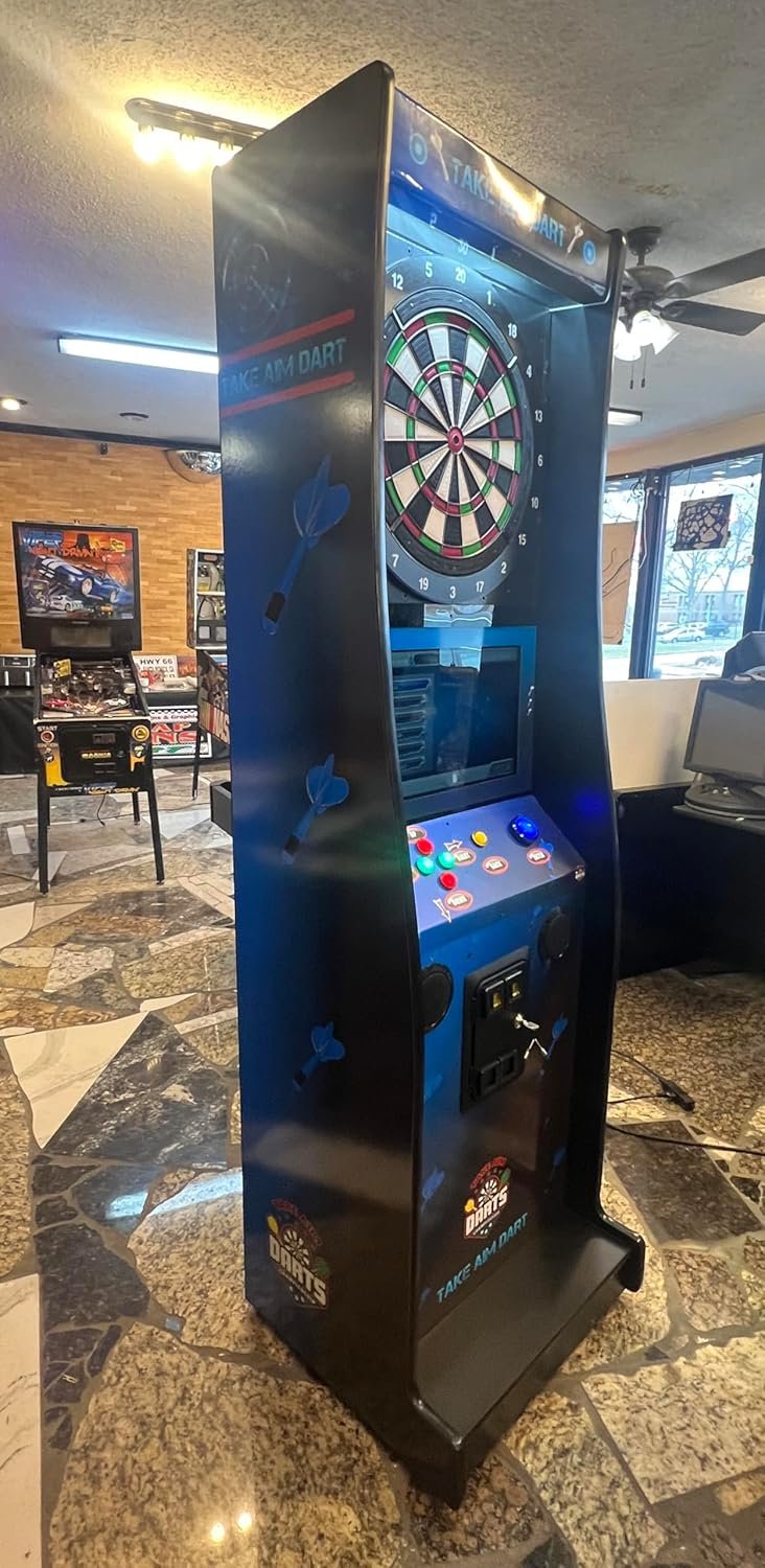 Introducing a heavy-duty electronic dart machine designed for home and commercial use, this affordable 4-player game features two monitors (23″ and 9″) and uses soft-tip darts for safety. It boasts an easy-to-use interface with auto-scoring and intelligent instructions. The machine is ideal for free play, supports various games like Cricket and High Score Competition, and includes a 6-month warranty alongside lifetime technical support. Dimensions are 86″ tall, 25″ wide, and 23″ deep, weighing 175 lbs. This reliable dartboard ensures fun and engaging gameplay for all ages.