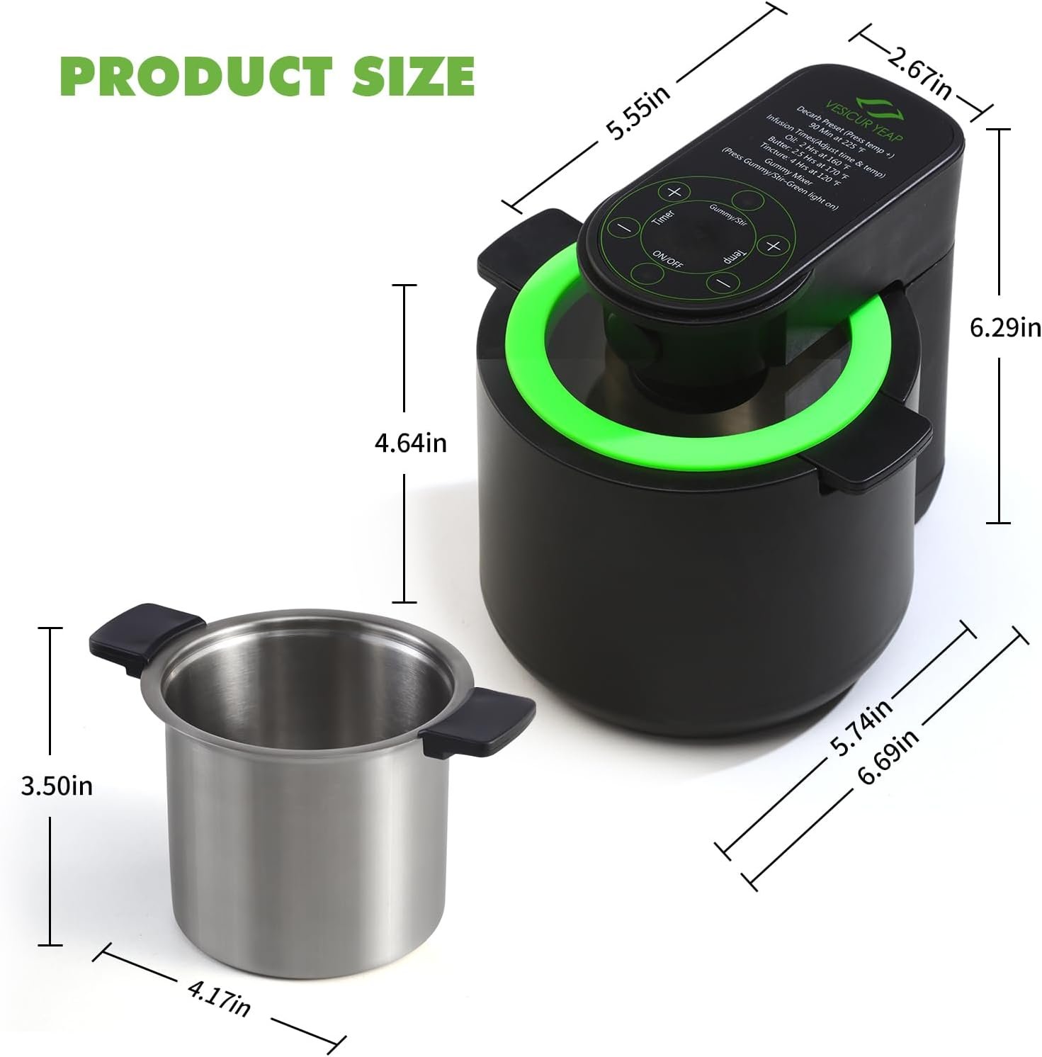 The Vesicur Yeap Herbnifique is a versatile 3-in-1 machine for decarboxylating herbs, infusing oils, and making gummies. It features precise temperature control, a digital control panel, and an automatic shut-off for safety. Included accessories, such as a stainless steel strainer, silicone molds, and an herbal recipe book, enhance usability. With a maximum infusion capacity of 550ml and a decarb capacity of 1.5 ounces, it efficiently extracts active compounds. Designed for easy operation with a compact, stylish appearance, it’s a valuable addition to any kitchen. Ensure it’s used under 110/120V for optimal performance.