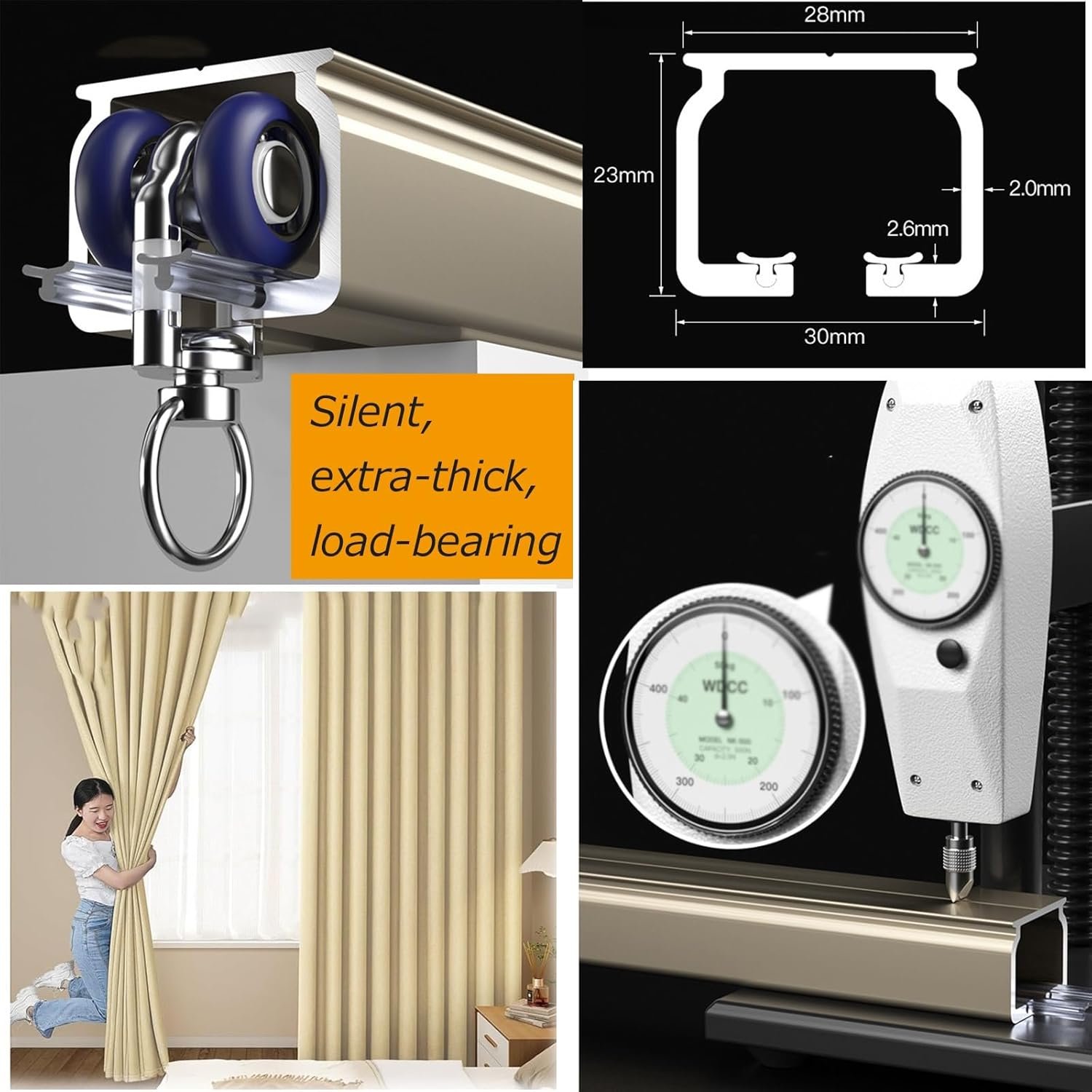 The curtain rail is made from premium aluminum, supporting at least 40 kg and designed for heavy curtains. Features include a universal bearing wheel for enhanced strength, low-friction runners for noise-free sliding, and easy installation for wall or ceiling mounting. It comes with necessary accessories like end caps and brackets. Tracks exceeding 1.4m are shipped in sections. This versatile system is suitable for various applications, including room dividers and installations in living rooms, bedrooms, and other spaces, all while offering an elegant design that adds luxury to any environment.