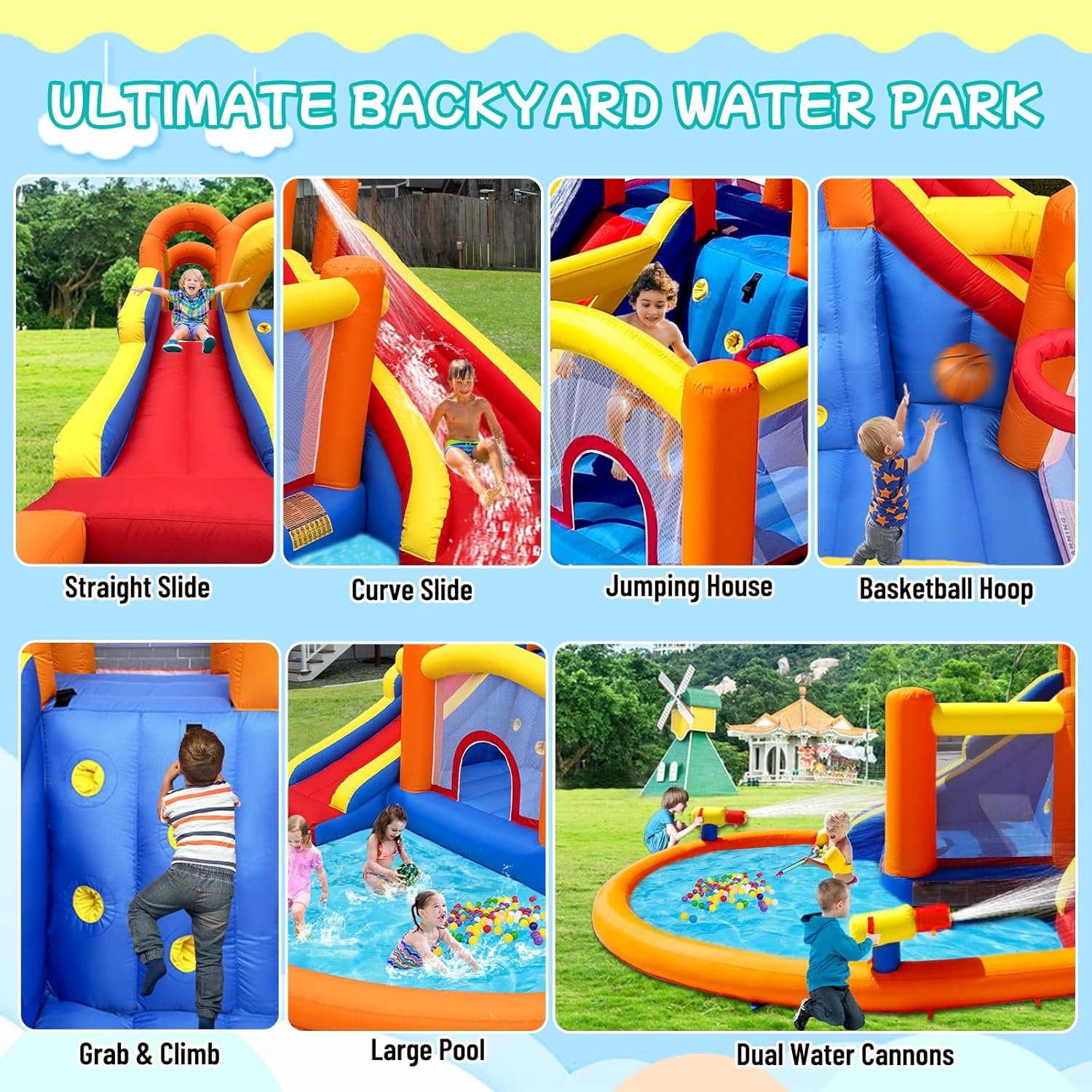 HuaKastro, a leading inflatables manufacturer from China, now offers high-quality products directly to consumers, making them affordable and accessible. The brand focuses on fostering children’s development through creativity and physical activity. Their ultimate backyard water park features six attractions: a bounce house, splash pool, dual slides, climbing wall, basketball hoop, and water cannons for endless fun. The durable design accommodates multiple kids, sets up in just two minutes, and meets safety standards. Ideal for gifts, it promises memorable summer adventures and parties.