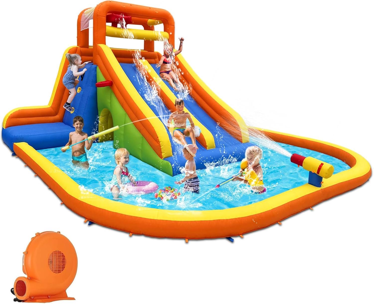 This inflatable water slide park offers exciting outdoor fun for kids aged 5-12. It features dual tall slides, climbing walls, a splash pool, a surprise water dump bucket, and additional water features. Constructed from durable, non-toxic PVC, it safely accommodates 4-5 children at once, with reinforced seams for added strength. Setup takes just 2 minutes, and it includes a blower, stakes, and a storage bag. Ideal for birthdays and parties, this portable waterpark provides countless hours of enjoyment while promoting exercise and fun in the sun.