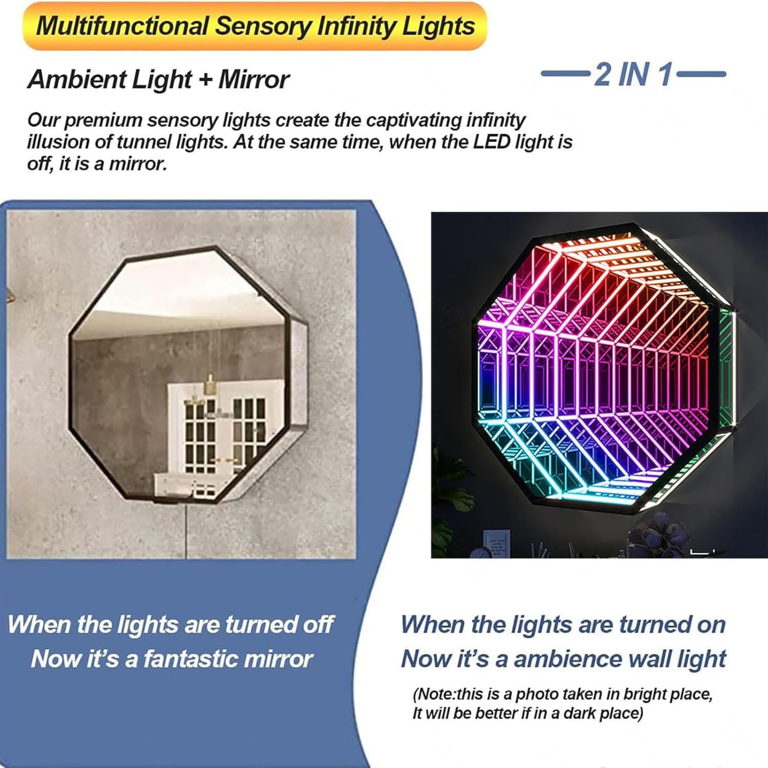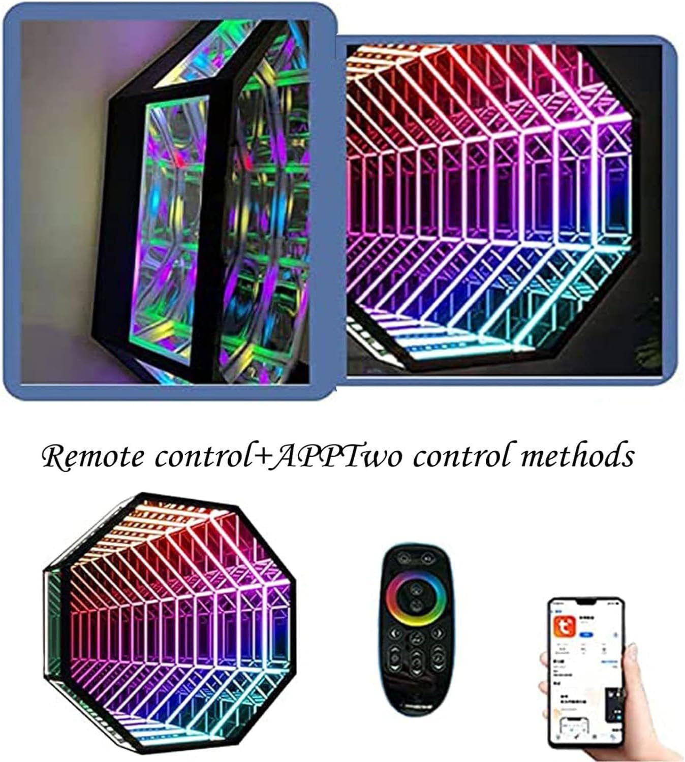 The RGB Mirror Tunnel Light resembles an ordinary mirror but transforms into a captivating display of multicolored light when activated, creating an illusion of an infinite tunnel. Ideal for various spaces like bedrooms, schools, and hallways, it features a stylish art deco design and comes in three sizes. The lamp offers 358 adjustable lighting effects, controllable via remote or smart app. Installation is straightforward, and it enhances any setting, from romantic dinners to lively parties. This versatile decoration adds vitality and magic, making environments more dynamic and engaging.