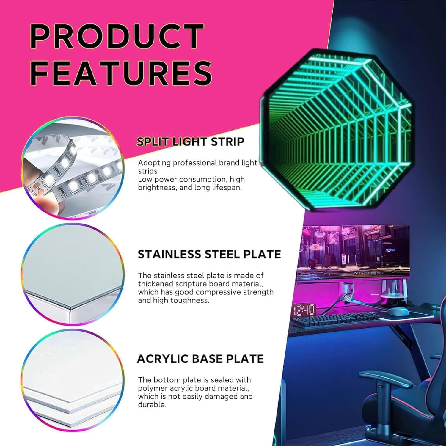 The RGB Mirror Tunnel Light looks like a regular mirror but transforms into a vibrant portal of RGB colors when lit. Perfect for bedrooms, schools, and more, its geometric design creates a captivating infinity illusion. Remote control makes it easy to personalize.