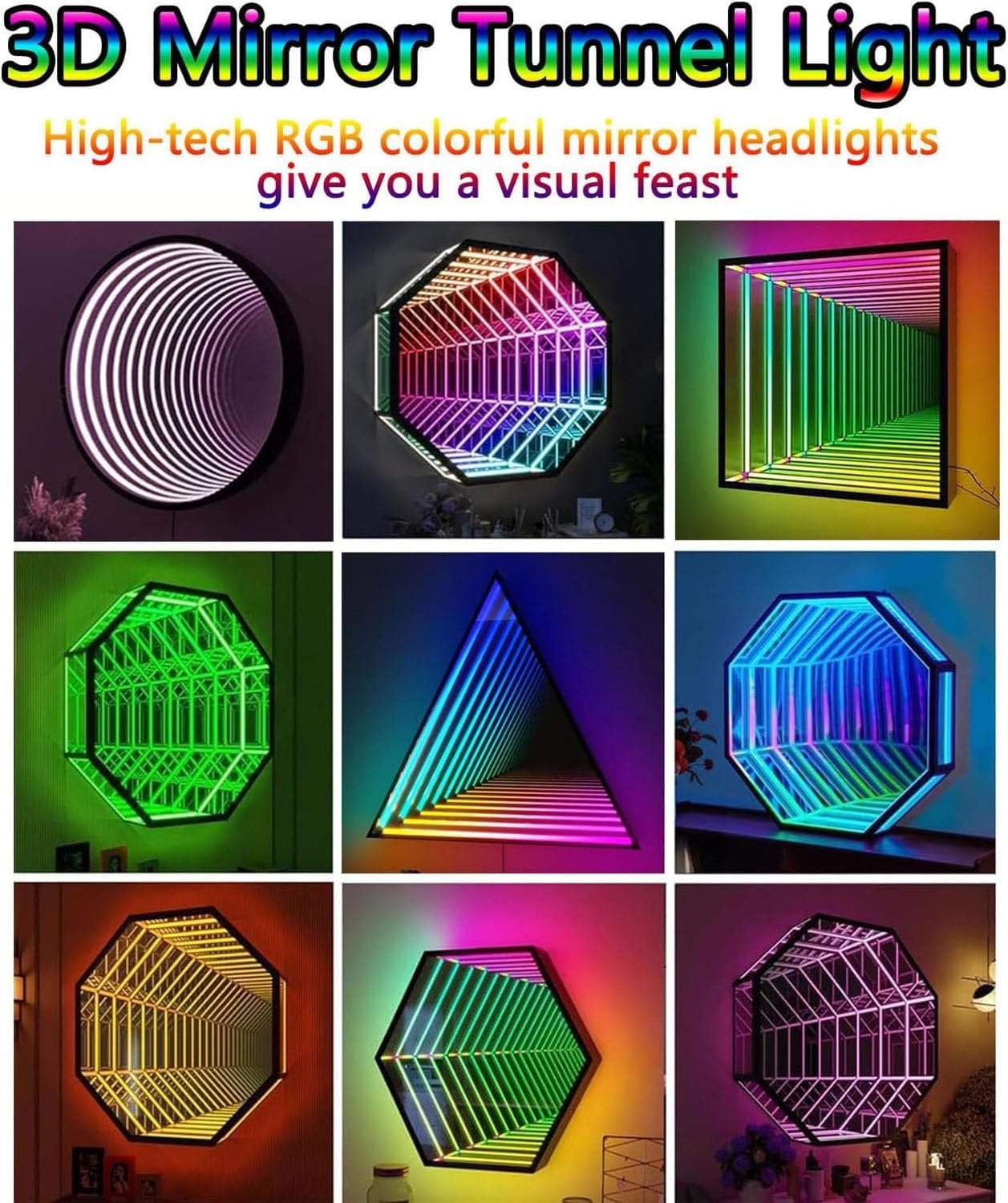 The Infinity Tunnel Mirror Light appears as a regular mirror but reveals vibrant RGB colors and dynamic illusions when lit. Ideal for decor in bedrooms, schools, and hallways, this Art Deco-style lamp features LED lights with 358 adjustable settings, controlled via remote or app. Its 3D effect adds ambiance to any occasion, while its design allows for easy wall mounting. Available in three sizes, the light provides warmth and creativity, making it perfect for romantic dinners or lively gatherings. Installation is quick and straightforward, enhancing various environments year-round.