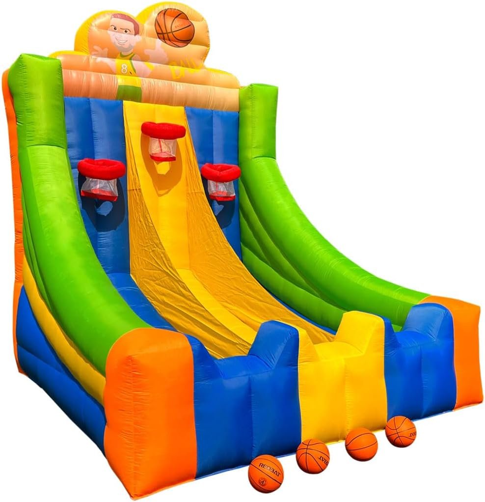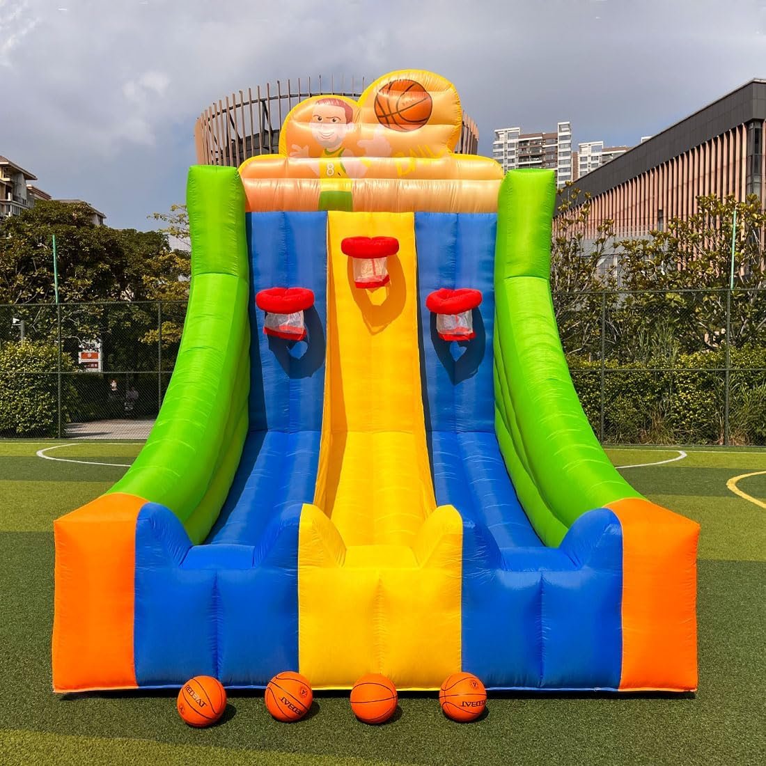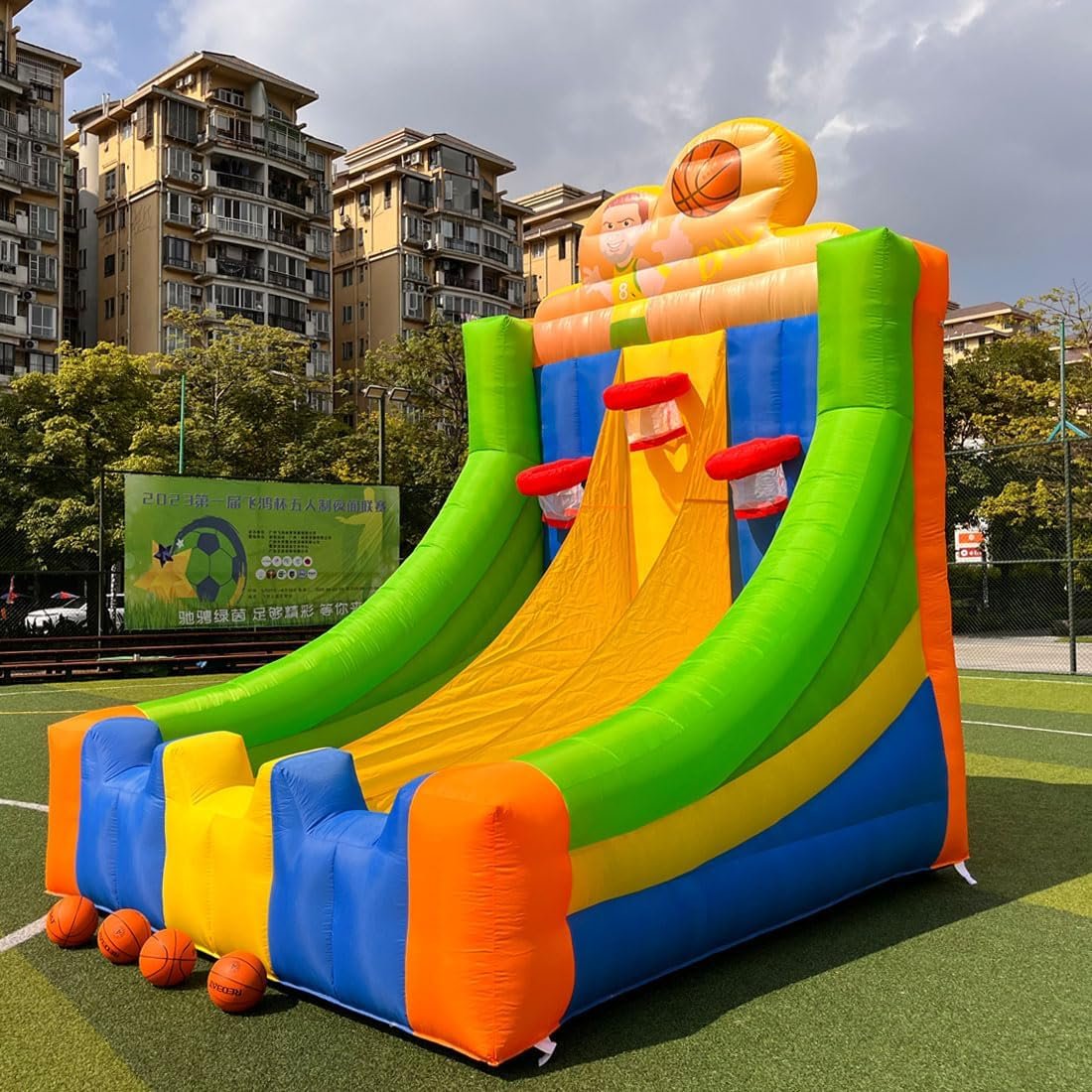 The Basketball Hoops Game is a vibrant 10ft wide, 11.5ft deep, and 13.1ft high inflatable, perfect for competitive fun at events. It features a sloped wall that returns balls for continuous play, making it enjoyable for all, including non-sporty participants. Players can race to score the most baskets in 60 seconds. Ideal for company fun days, school fairs, and team-building activities, this inflatable basketball game is both engaging and suitable for all ages. It weighs 50.4 pounds and is made by Vinfgoes.