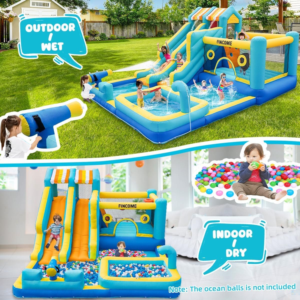 The 10-in-1 inflatable water slide bounce house features double slides, climbing wall, basketball hoop, and water games, designed for indoor and outdoor use. It includes a 750w electric blower for easy setup and safety nets for child protection. Made of durable, waterproof Oxford cloth, it accommodates multiple kids simultaneously. The package comes with all necessary accessories for fun and easy transport. Parents are advised that the blower must remain on during use, and some bubbling at seams is normal. This bounce house offers endless entertainment and is a fantastic gift for children.