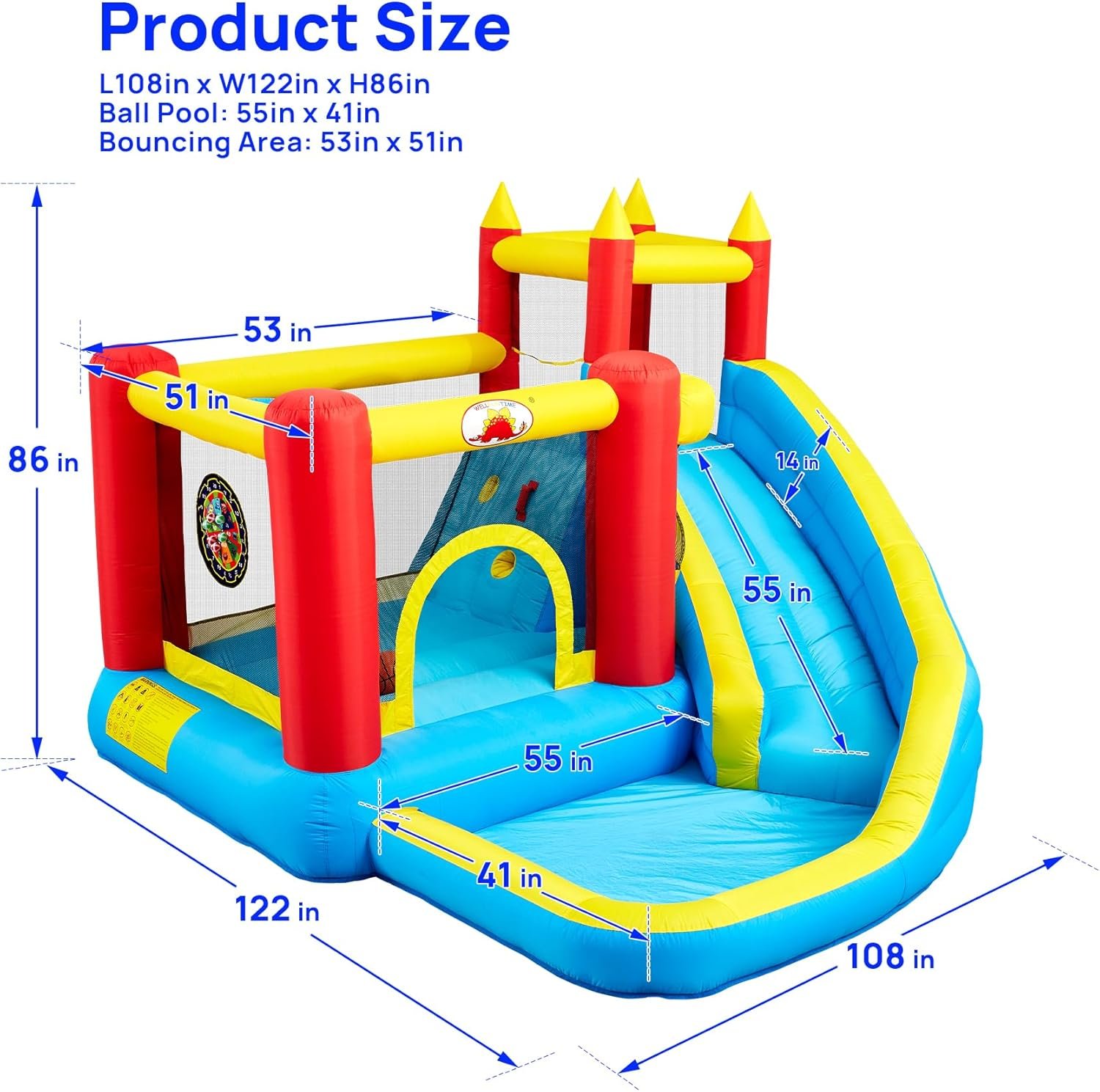 Inflatable Bounce House with Slide, Jumping Castle with Blower, Climbing Wall, Dartboard, Basketball Hoop and 50 Ball Pit Balls, 108x122x86 Inch