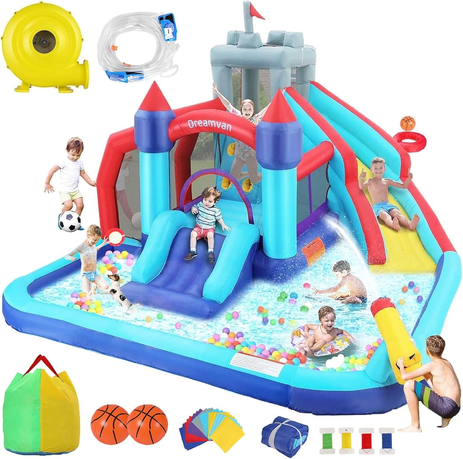 The Inflatable Water Park Bounce House is a vibrant, multifunctional play area for kids, featuring a spacious bounce area, slides, a climbing wall, and a pool for summer fun. Designed from durable materials with safety mesh, it promotes active play and balance. The included 750W blower inflates it in just two minutes and allows for quick deflation. Accompanied by various accessories like inflatable balls and a carrying bag, this bounce house can turn any yard into a water park. Ideal for parties, it also comes with a one-year warranty and excellent customer service.