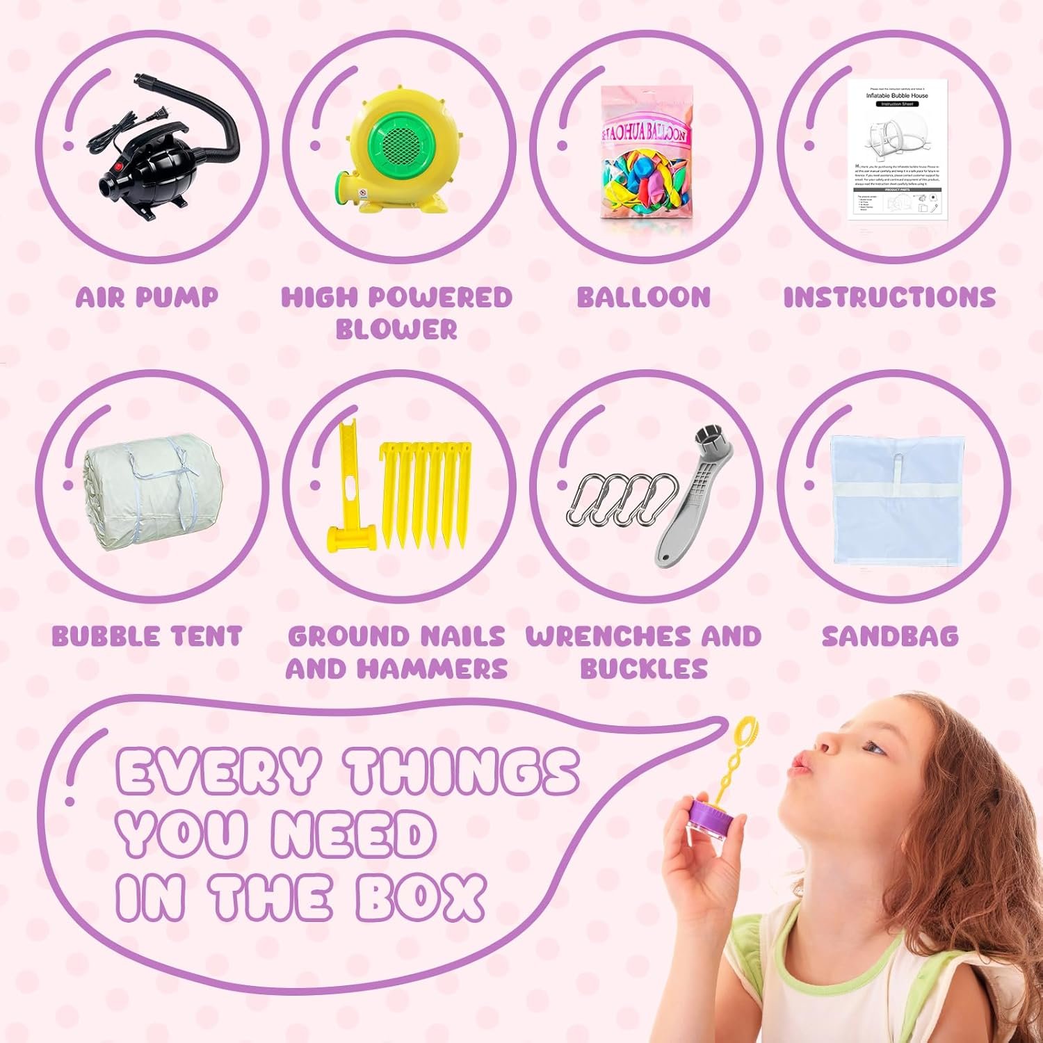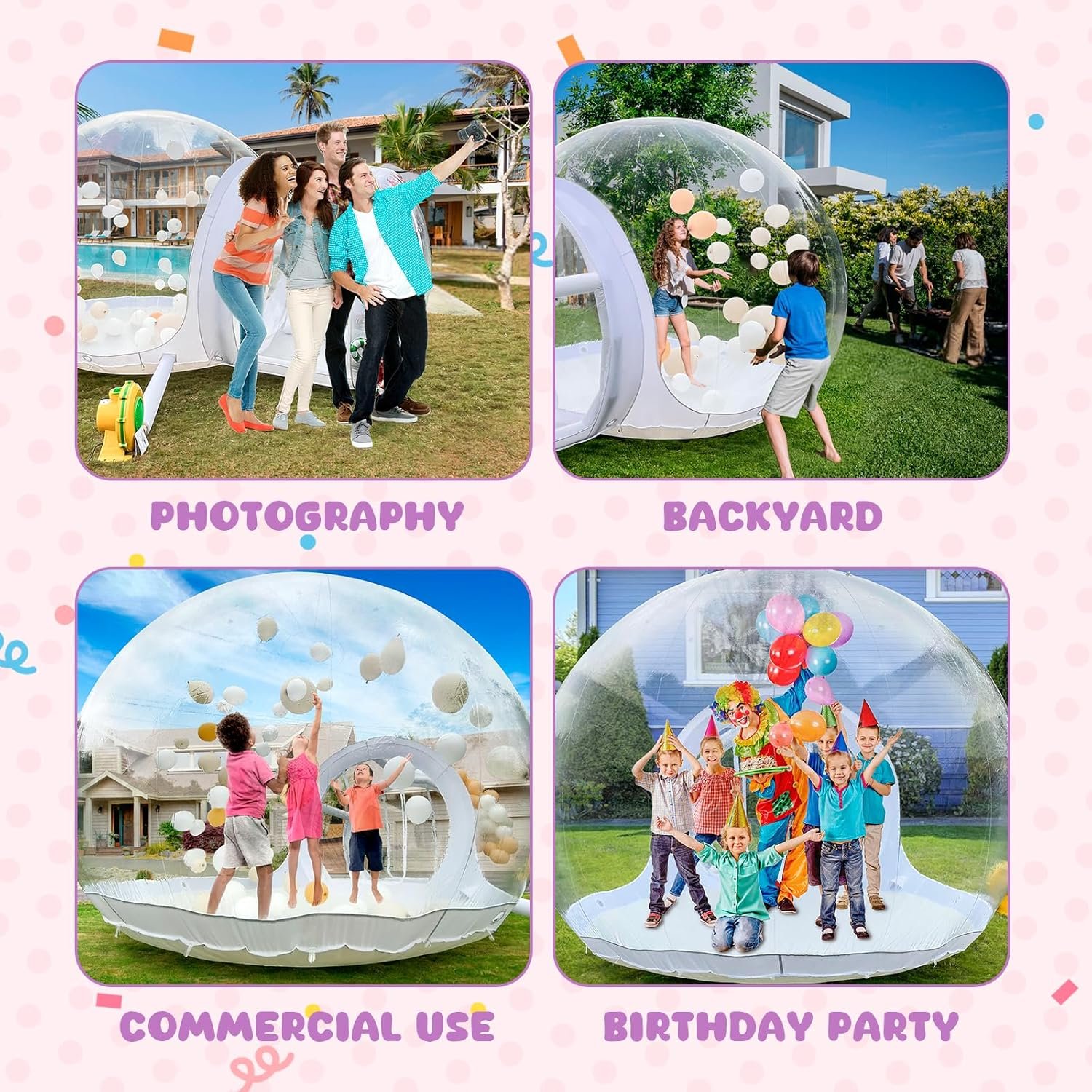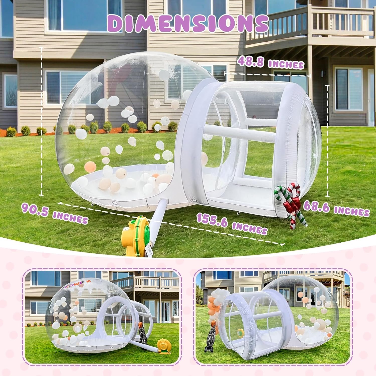 The Inflatable Bubble Dome House offers fun for both adults and children, featuring a 10FT diameter bubble and a 5.7FT height tunnel. Made from high-quality, durable materials, it can accommodate up to five kids or three adults. The product includes inflatable bouncers, a blower, an electric pump, and a repair kit, and can be quickly set up in under five minutes. An unboxing video demonstrates usage, setup, and comparisons with other products. The package includes a powerful blower for the bubble and a black pump for the tunnel.