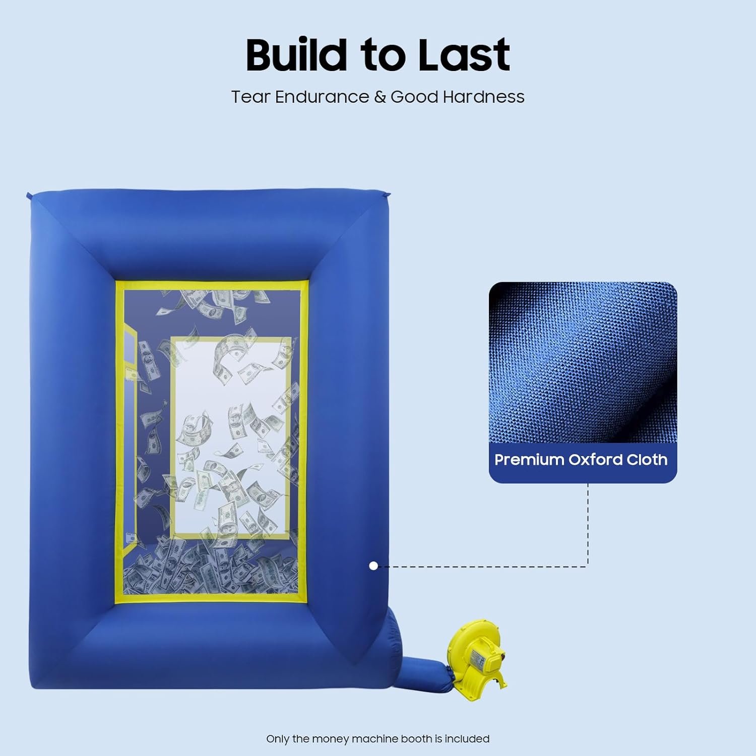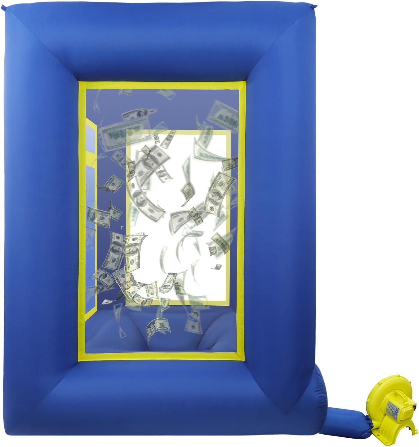 The Inflatable Money Machine Booth is ideal for promotions, events, and parties like weddings and Halloween. Participants enter and try to catch flying money within a set time, following specific rules to ensure fairness. It features vibrant colors, is made from durable Oxford cloth, and includes elements for engaging gameplay, like airflow vents and a visual window. The booth is portable, easy to set up, and suitable for various gameplay options involving real and fake money. Please note that an air blower and cash are not included. Ideal for creating excitement at any gathering.