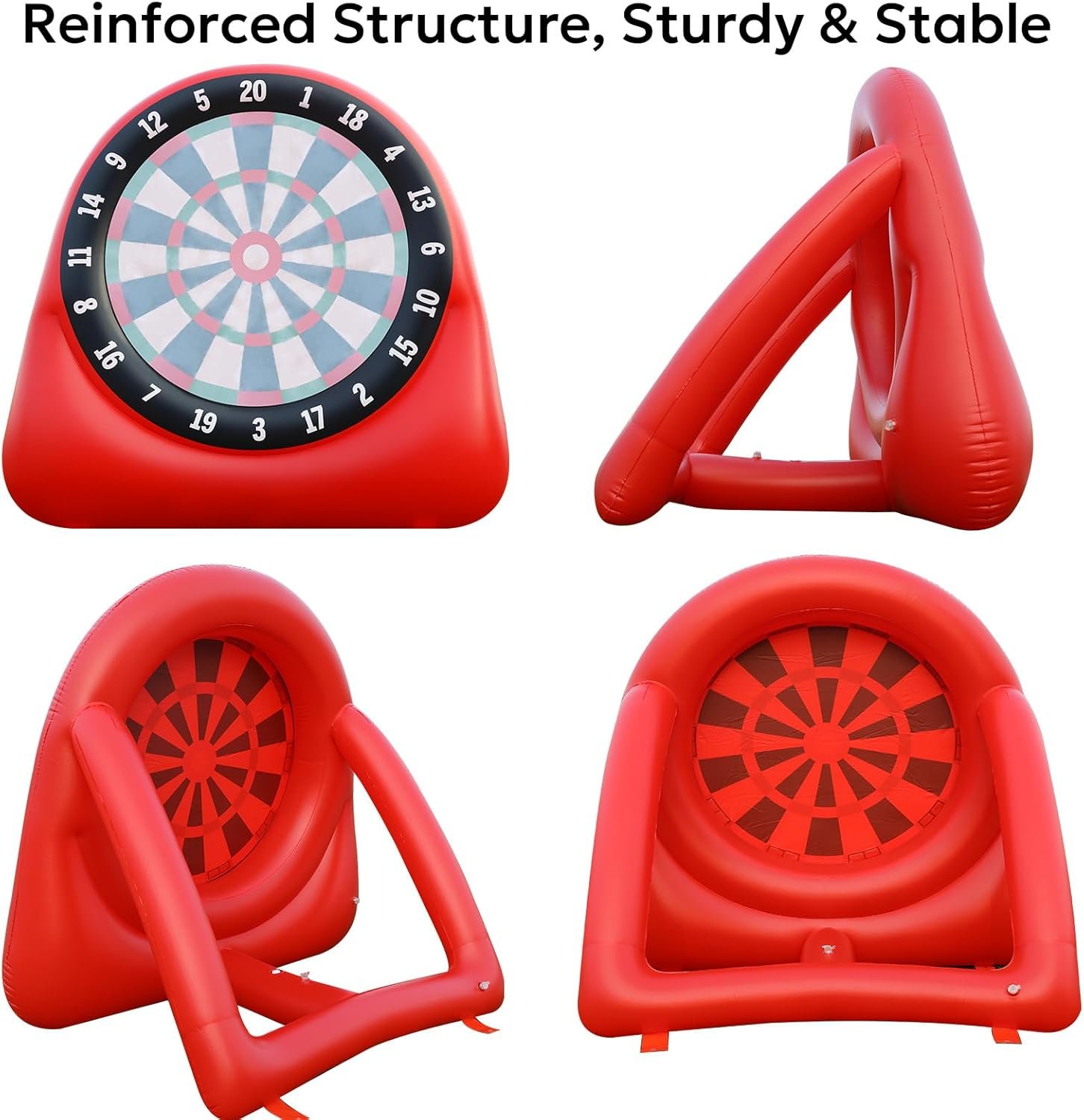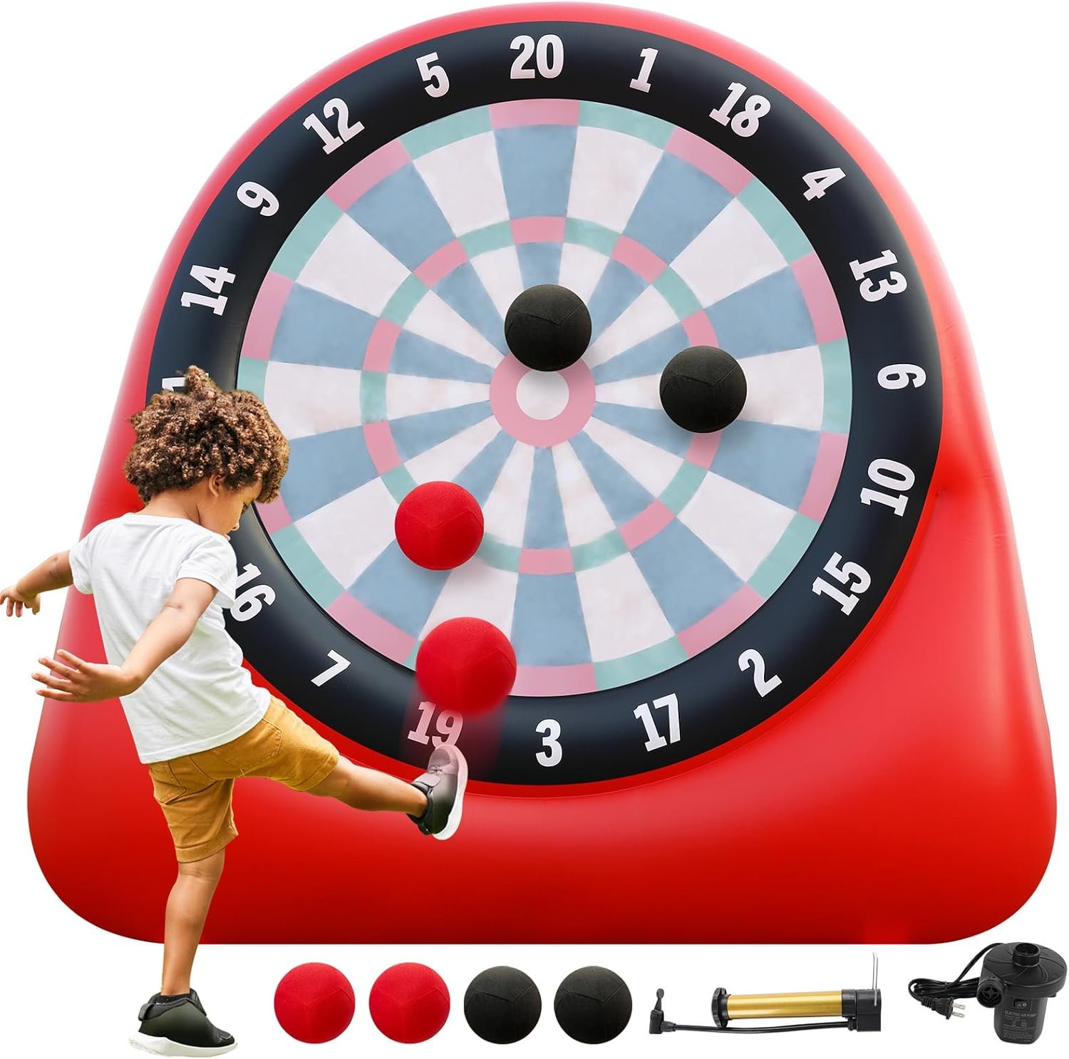 The AONESY inflatable soccer dart board combines soccer and darts for engaging outdoor fun, suitable for both kids and adults. It inflates quickly in 3 minutes using a 130W electric pump and is easy to store for transportation. Made of durable, puncture-resistant PVC, it ensures safety during play. The set includes four kick balls, two pumps, nails, and repair kits, allowing versatility in gameplay beyond soccer. Perfect for family gatherings, birthday parties, and community events, it promotes active fun and friendly competition.