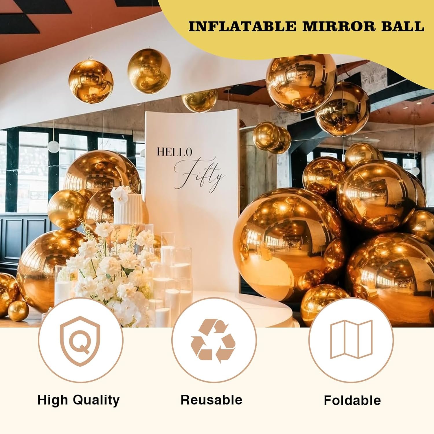The inflatable mirror ball set includes six reusable, durable balls of various sizes (15.7″, 23.6″, 31.5″, 47.2″, 59″) made from 0.4mm PVC and 0.3mm reflective film. An electric pump is included for easy inflation, and each ball features D-rings for hanging or can be placed on surfaces or water. Suitable for various events like parties, weddings, and showcases, these lightweight balls fold easily for convenient storage. Caution is advised to keep away sharp objects to maintain their integrity.