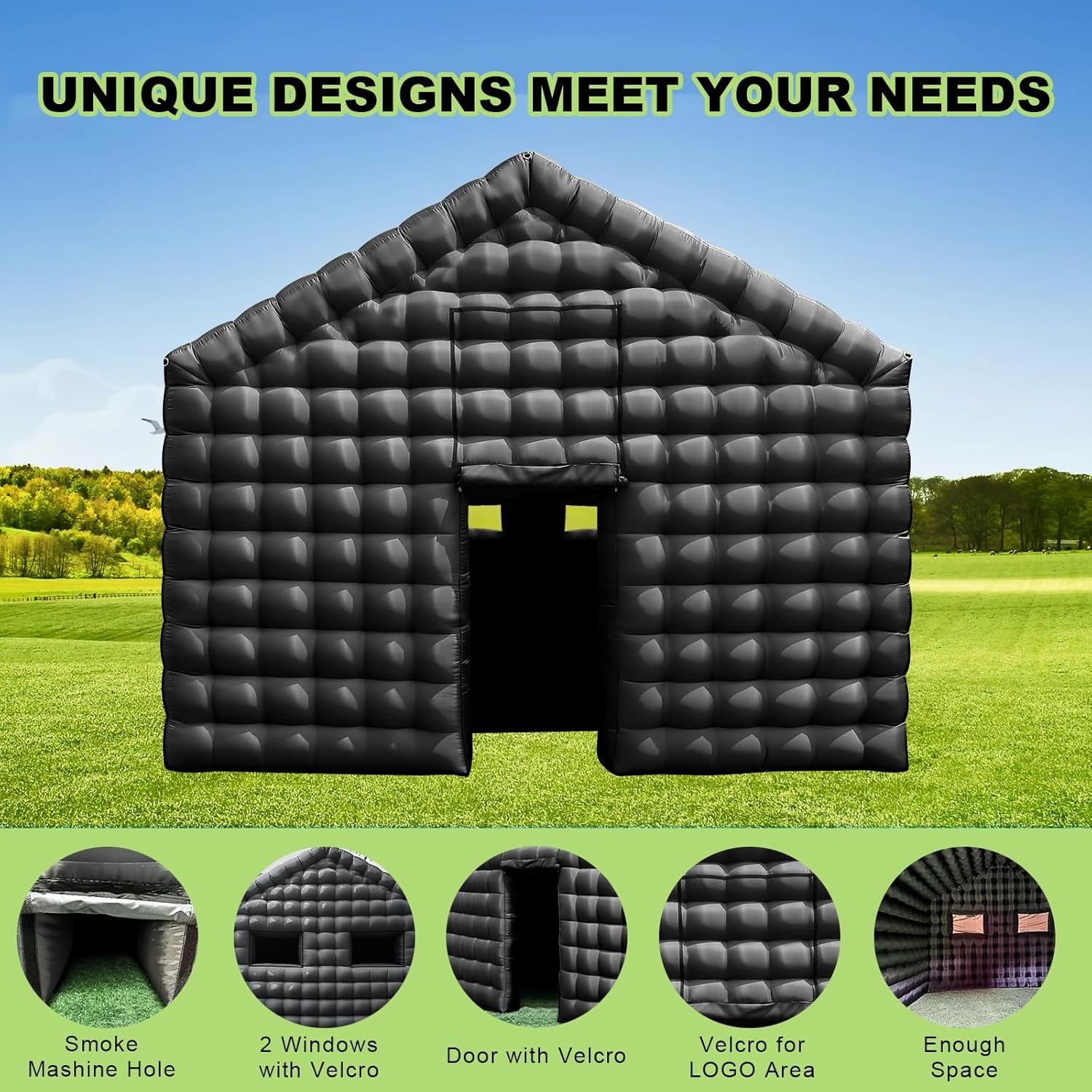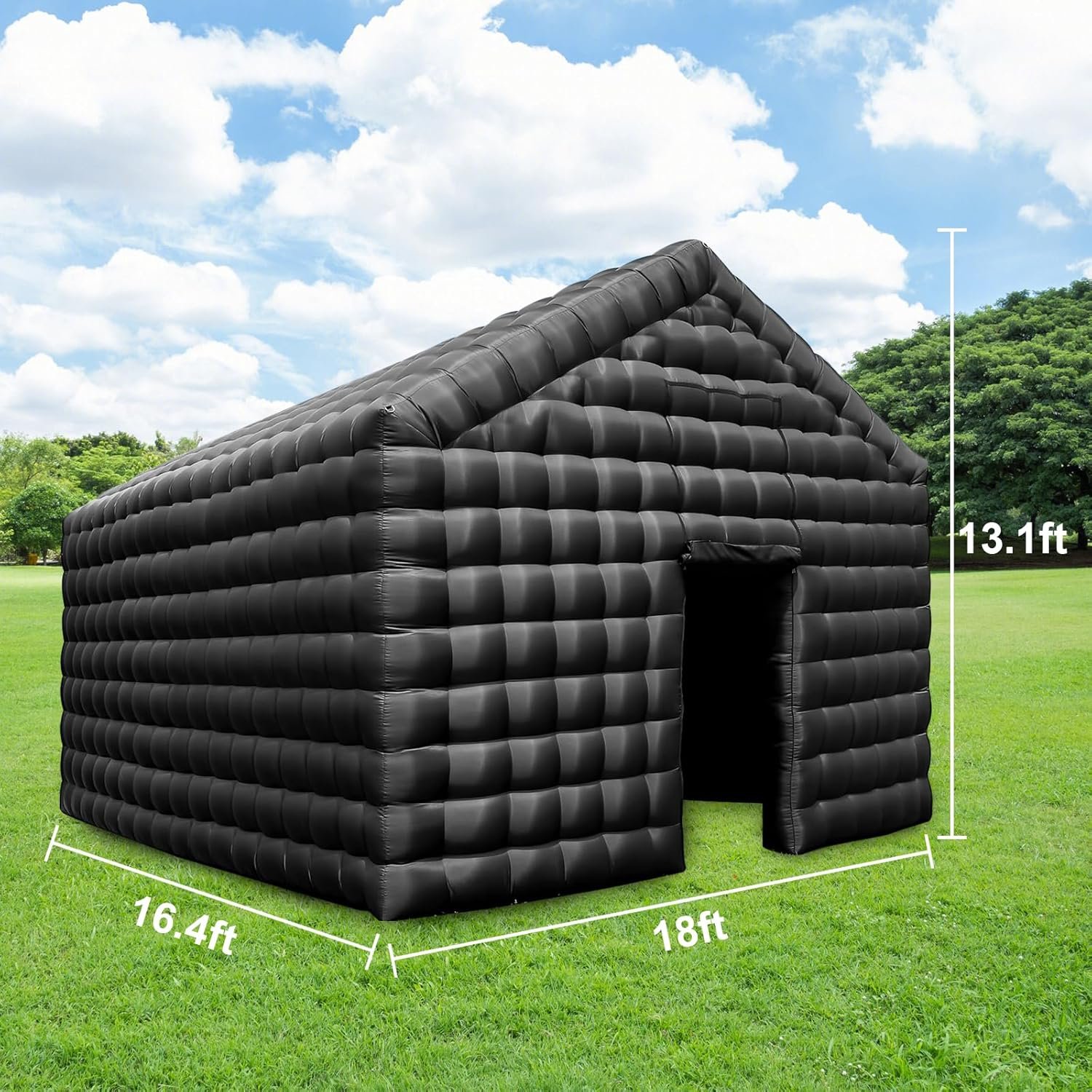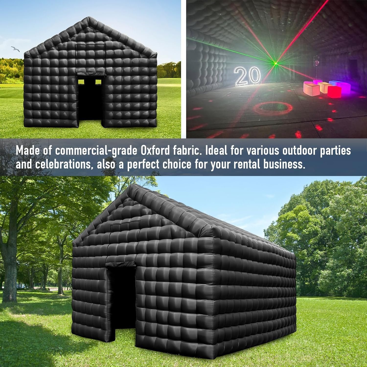 Elevate your event with the Inflatable Nightclub Party Tent. Made from durable 210 Oxford fabric, it measures 18ft x 16.4ft x 13.1ft, perfect for weddings and parties. Quick setup with an included blower, plus D-rings for disco lights! Features a smoke machine hole for an unforgettable atmosphere.