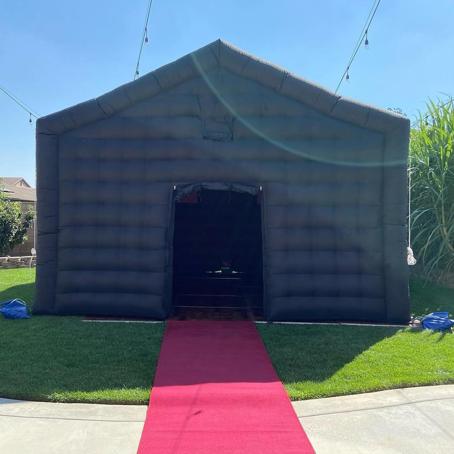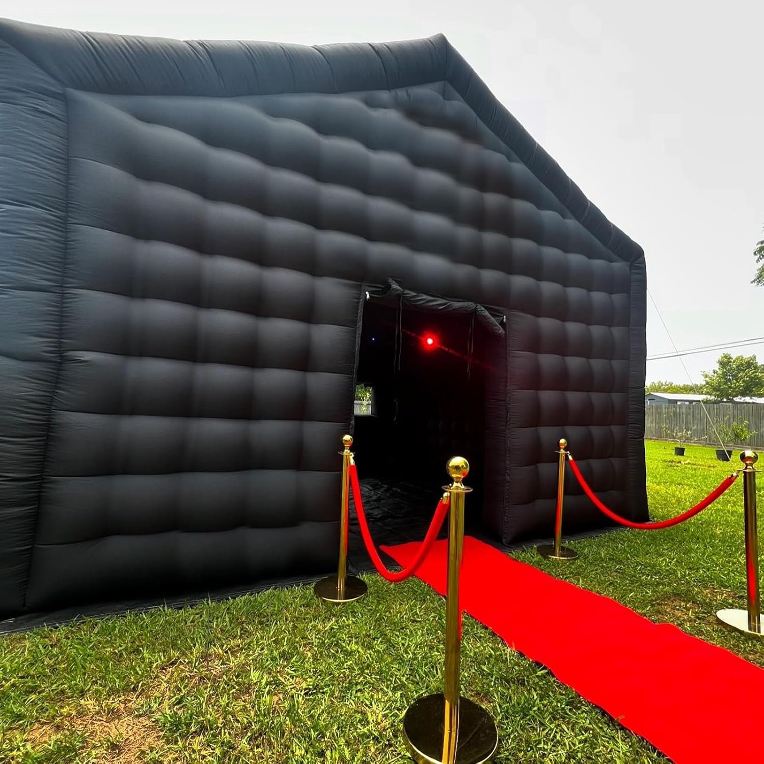 The Inflatable Nightclub Party Tent, made of durable 210 Oxford fabric, measures 18ft x 16.4ft x 13.1ft, ideal for events like weddings and private parties. It features a foldable door, windows for air circulation, and a built-in smoke machine hole for special effects (smoke machine not included). Quick setup is facilitated by an included blower, and D-rings allow for hanging decorations. Suitable for both indoor and outdoor use, the tent comes with ground stakes, ropes, and a storage bag. Proper handling is crucial to ensuring longevity and performance, especially during adverse weather conditions.