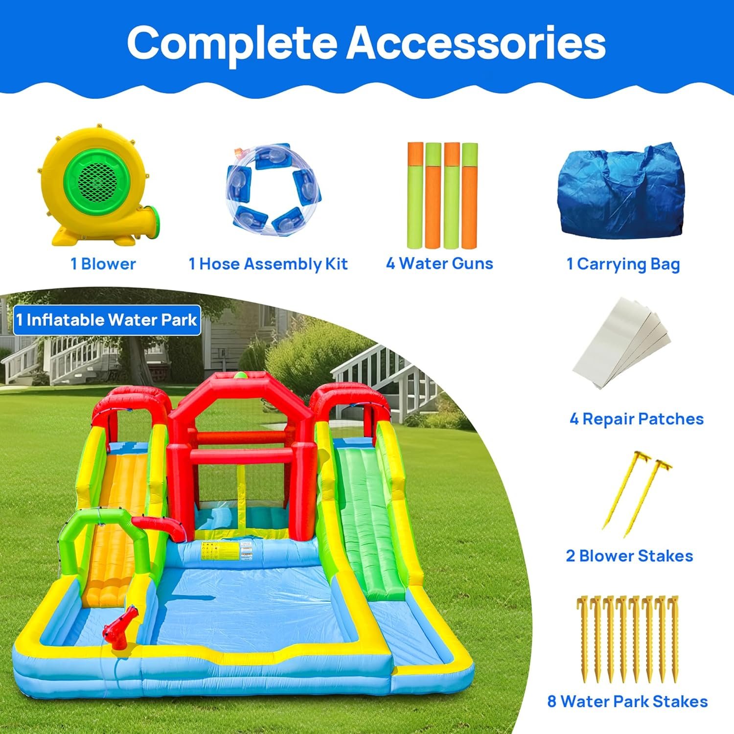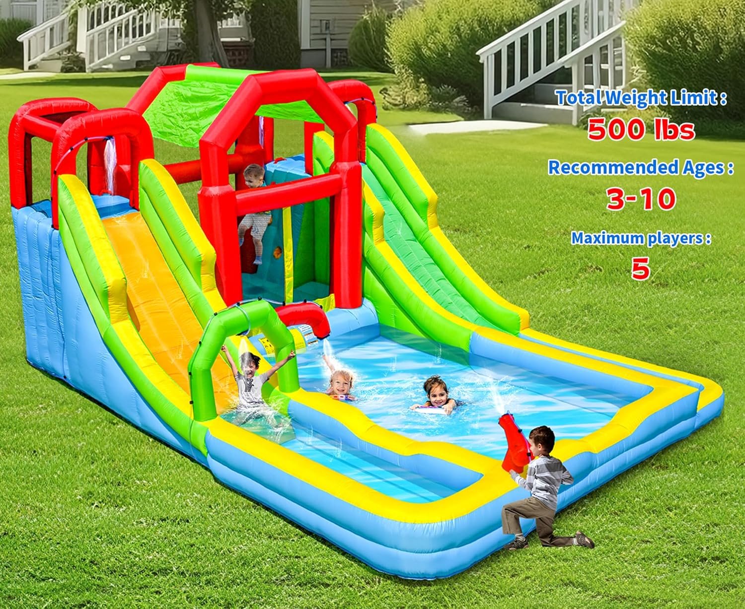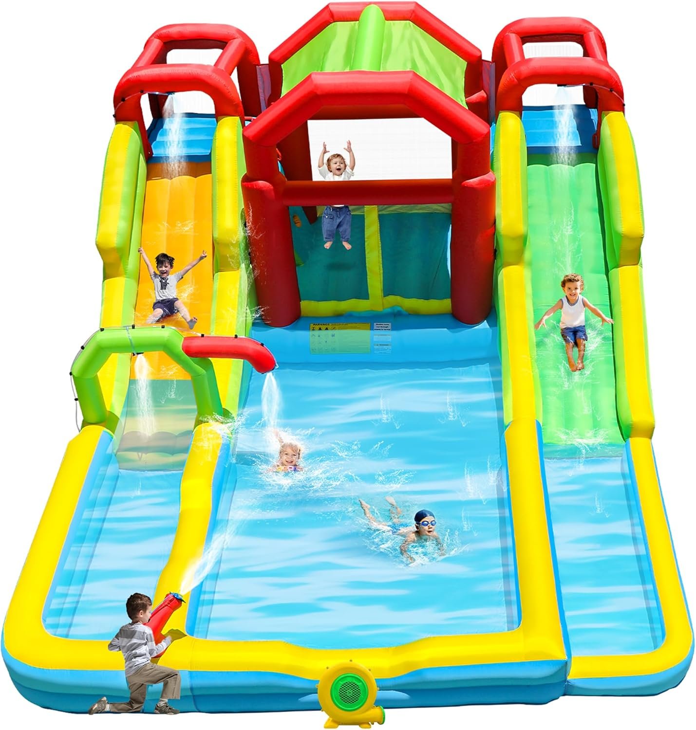 Inflatable Water Double Slides Park with Blower, Shade Tent Bounce House with 2 Climbing Walls, 3 Water Pools, 226x168x98 Inch