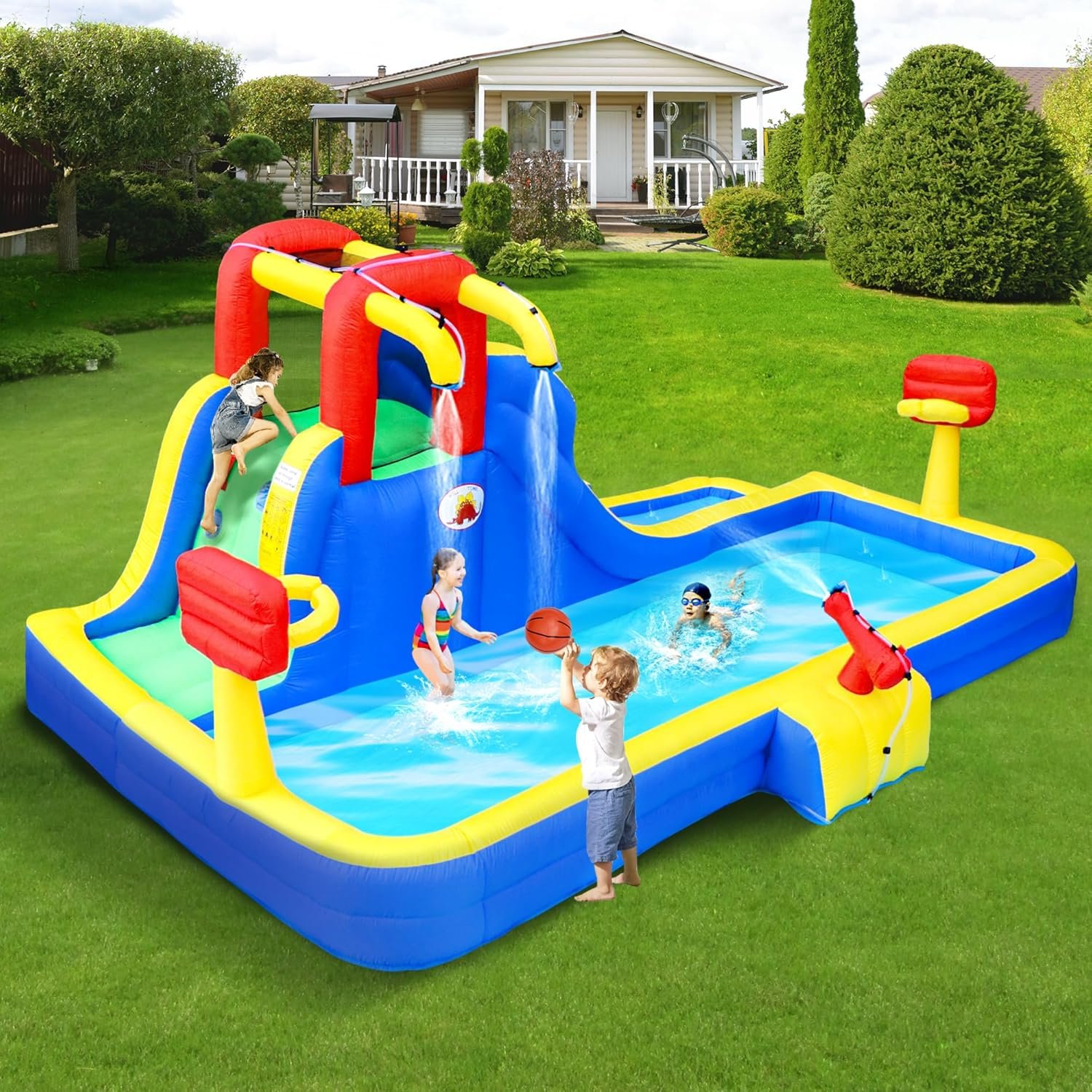 The inflatable water park is made from non-toxic, durable polyester fibers, ensuring safety and longevity with double seams and lining. It features colorful slides, pools, water sprays, and basketball rings for endless fun and varied gameplay, providing kids with competitive and adventurous activities. The setup is quick and convenient, inflating in under two minutes with a garden hose connection. Accessories include a blower, stakes, repair patches, basketballs, and a carrying bag, promoting sharing and exercise while creating a healthy growth environment for children.