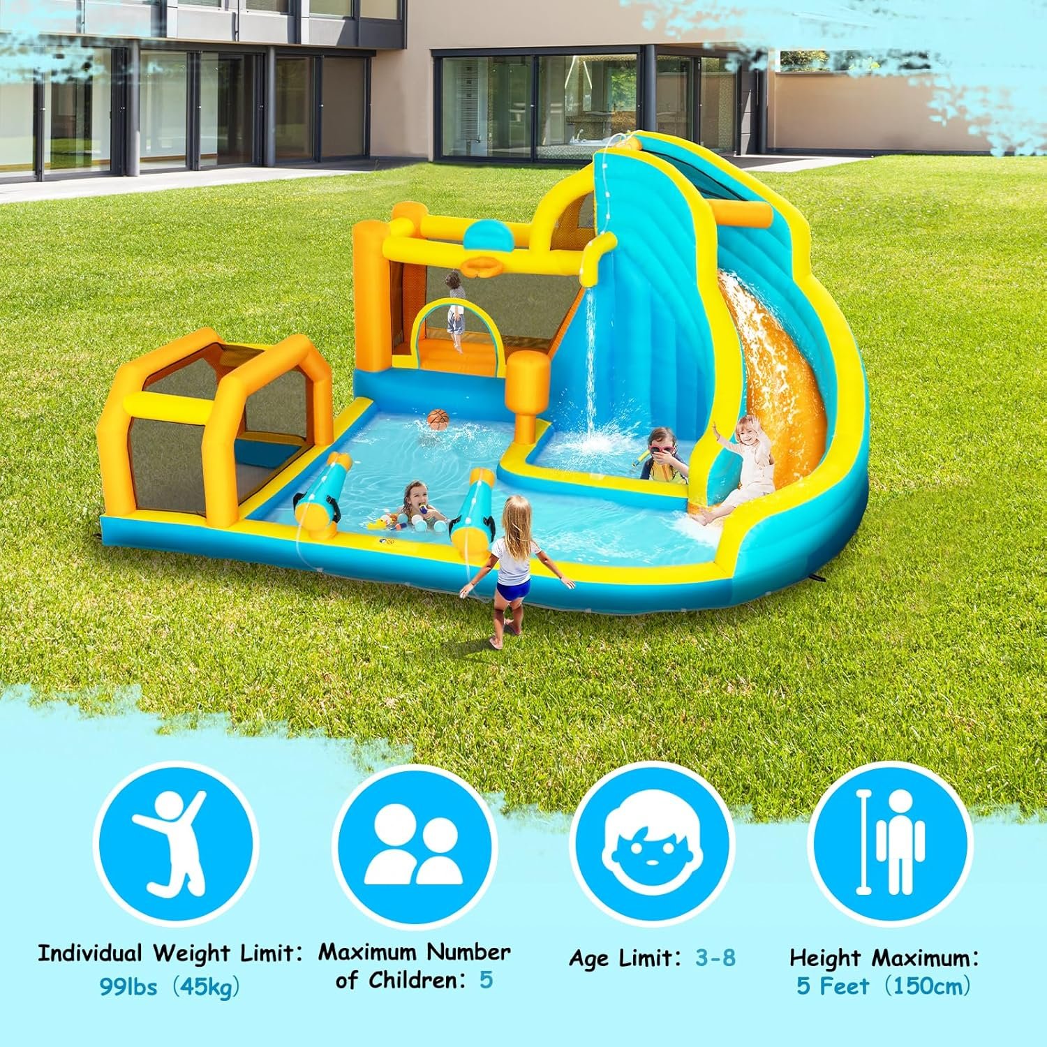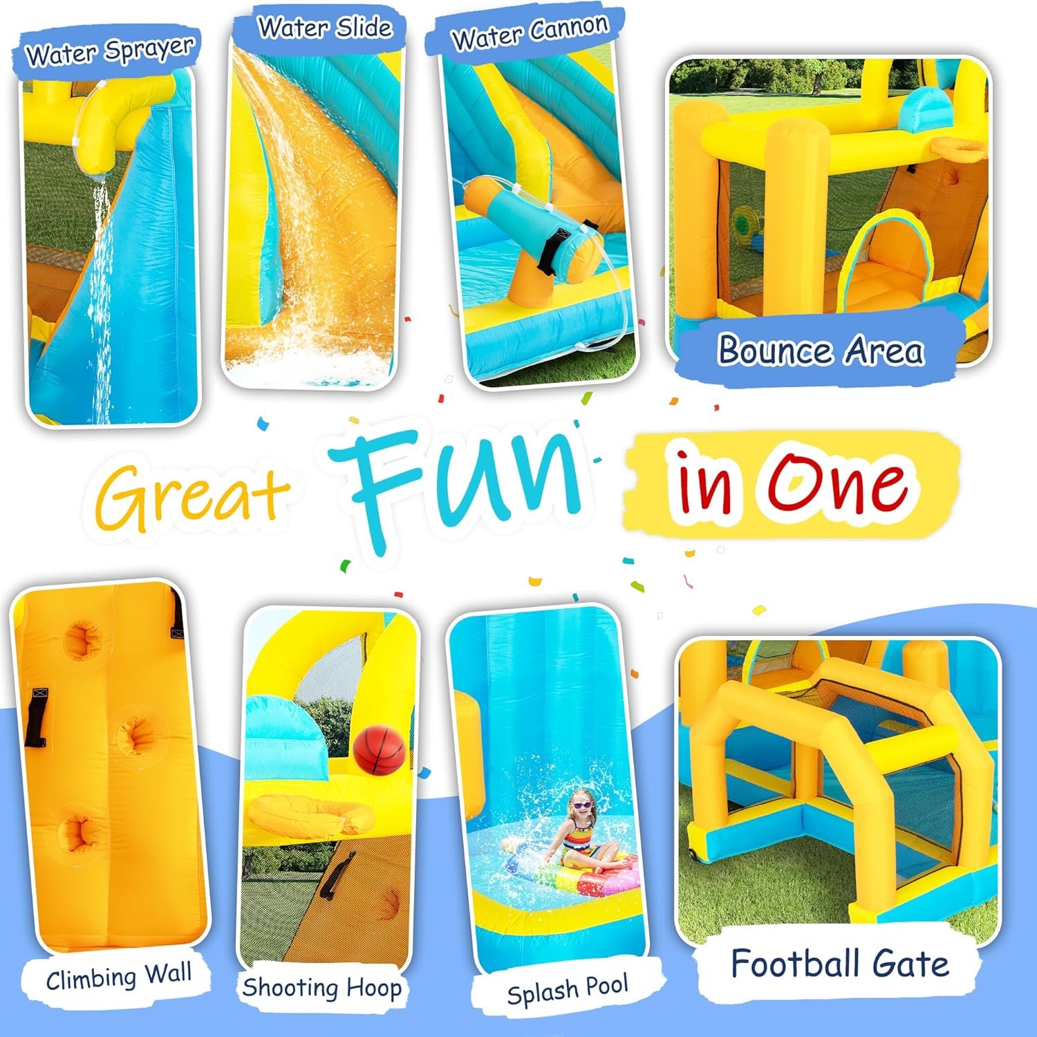 Inflatable Water Slide for Kids,8-in-1 Bounce House Water Park with 450W Blower,Climbing Wall,Splash Pool,Basket-Rim,Football Gate,Water Cannon,Great Party Gift for Kids Backyard