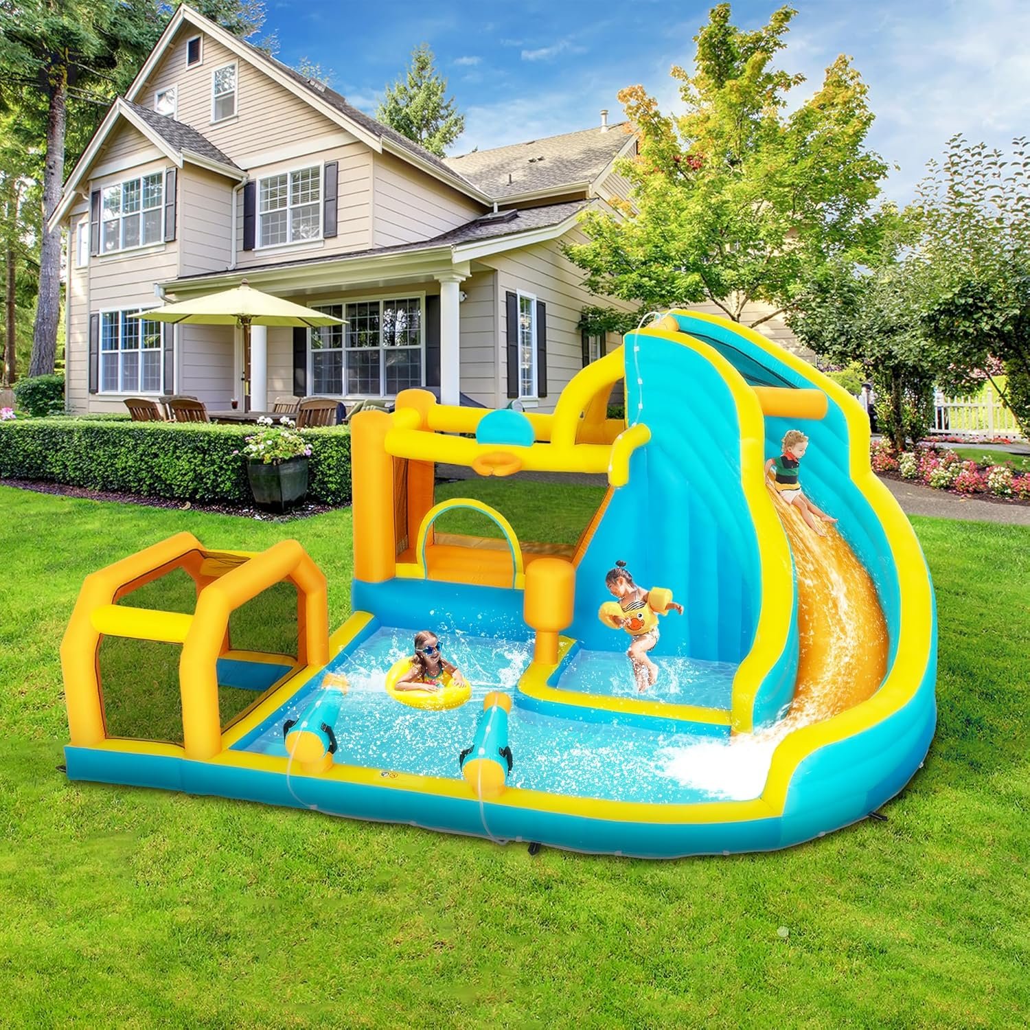 Enjoy endless fun with Bowthy’s inflatable water slide, crafted from premium materials for durability and safety. Perfect for kids aged 3-8, it features slides, a climbing wall, and a splash pool. Setup is quick with the 450W blower, so dive into adventure!