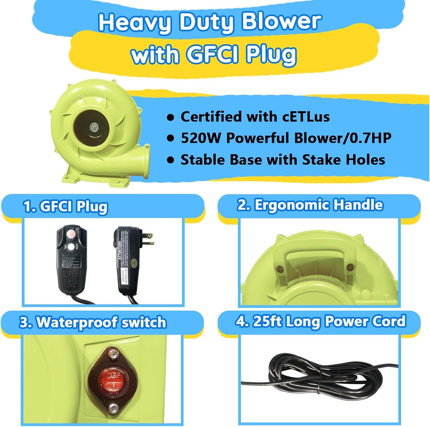 The Causeair water slide bounce house, ideal for kids aged 3-12, encourages outdoor play and healthy activity, reducing screen time. Built with non-toxic materials and featuring safety nets, it ensures children’s safety during fun. With extra-long slides, a jumping area, splash pool, and water spray gun, it offers varied entertainment. The inflatable setup is quick and portable, easily deflated for storage. Backed by a 90-day warranty, the package includes a heavy-duty blower, stakes, repair patches, and a carrying bag, promising customer satisfaction. Dimensions are 14.2L x 13.8W x 8H ft with a weight limit of 350 lbs.