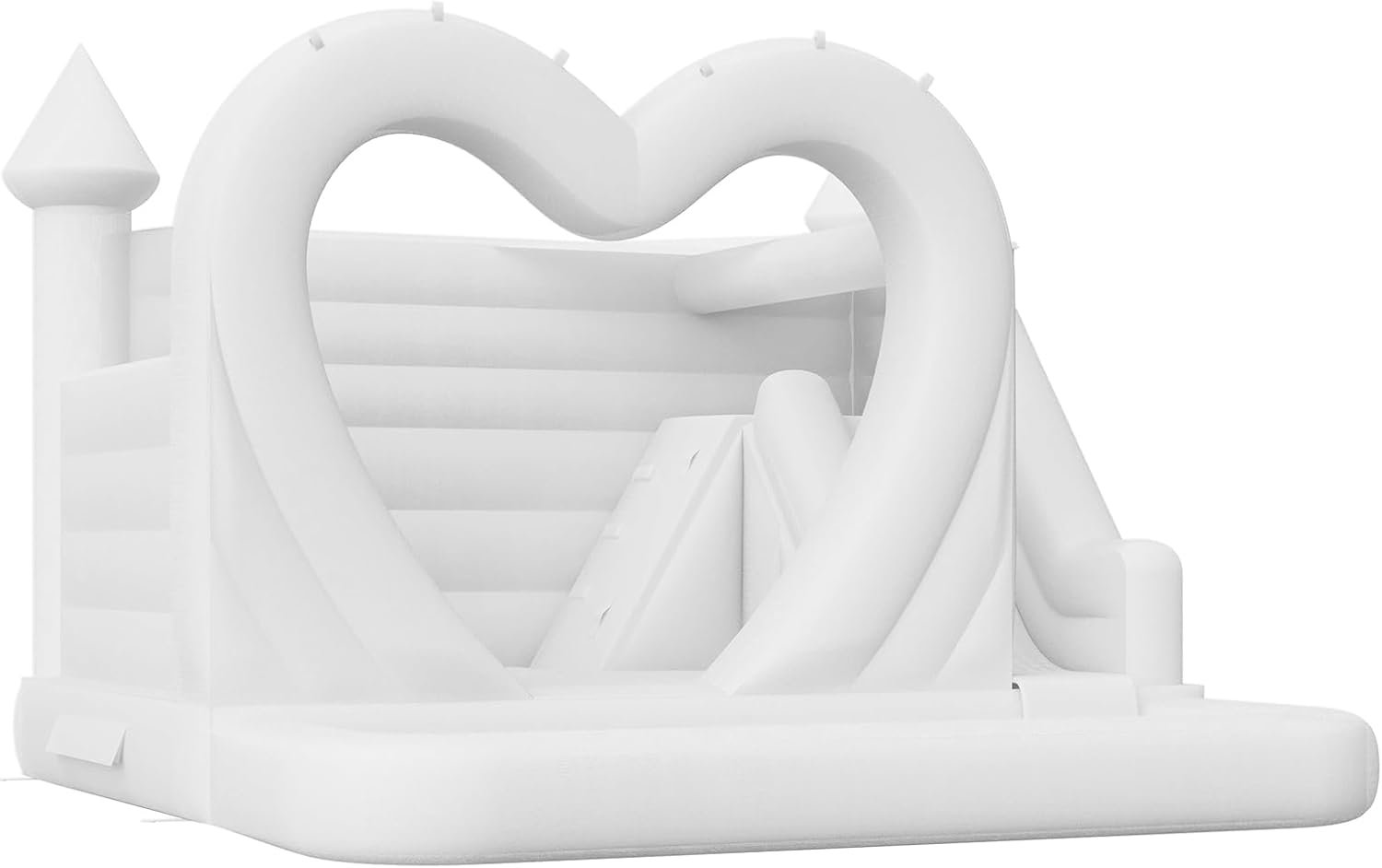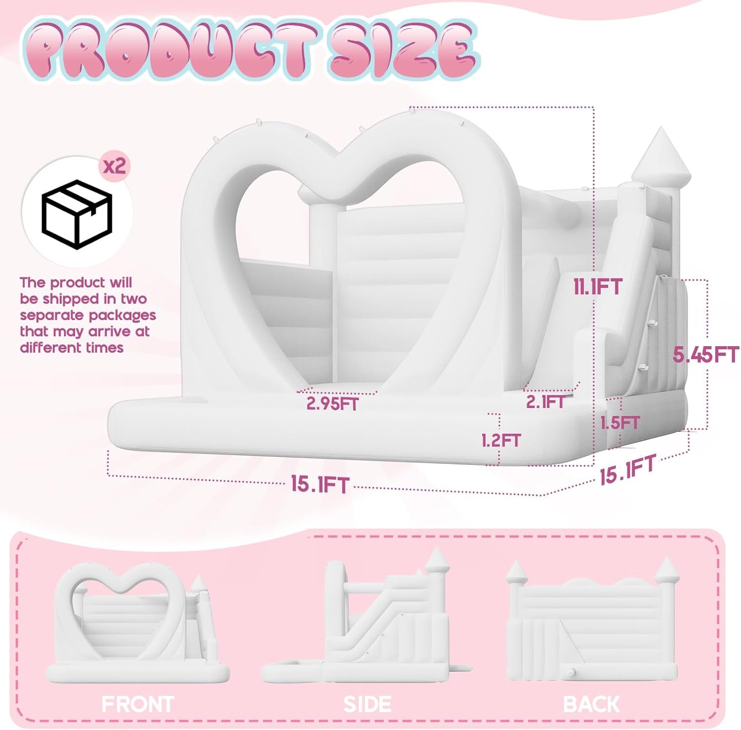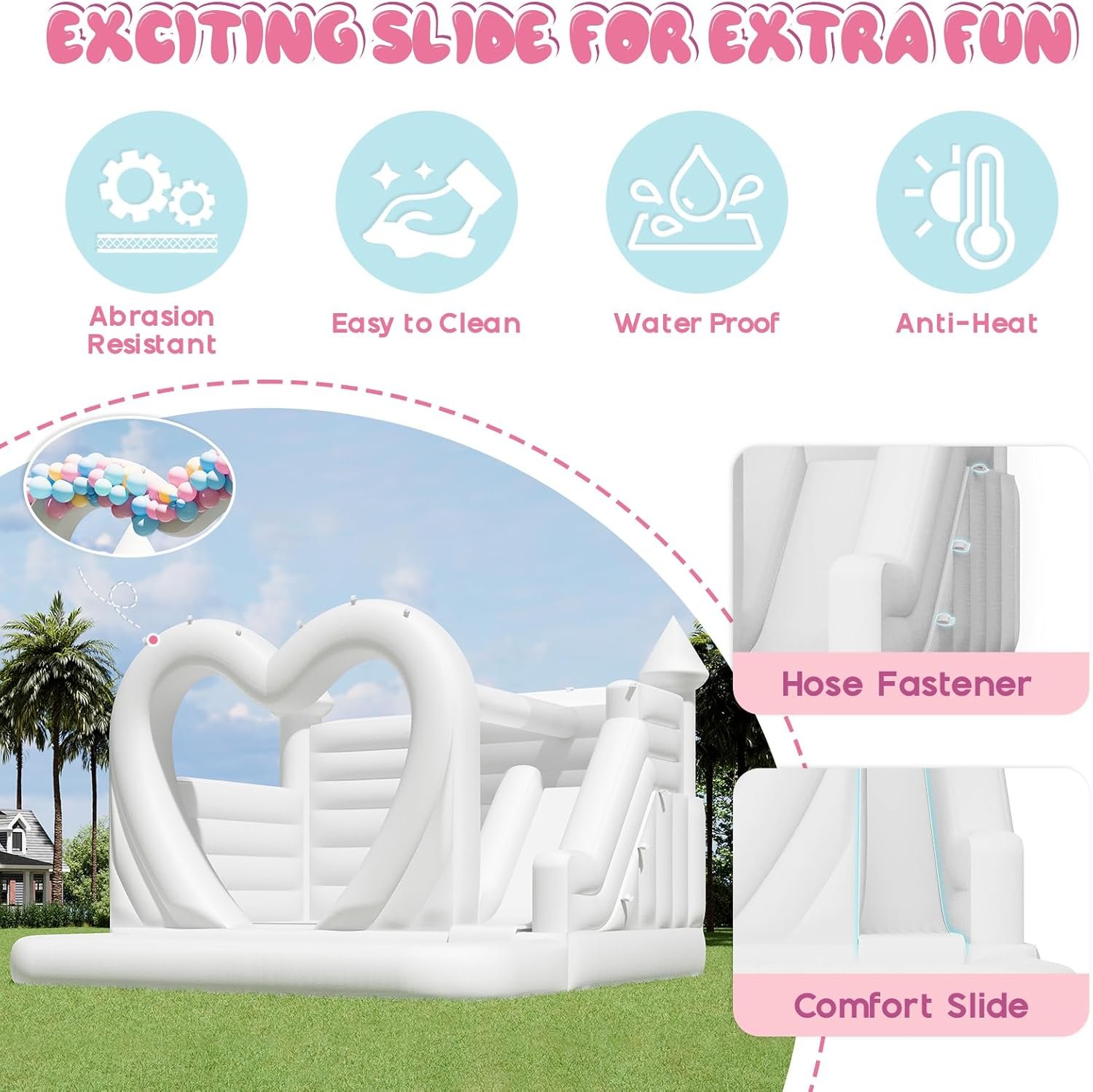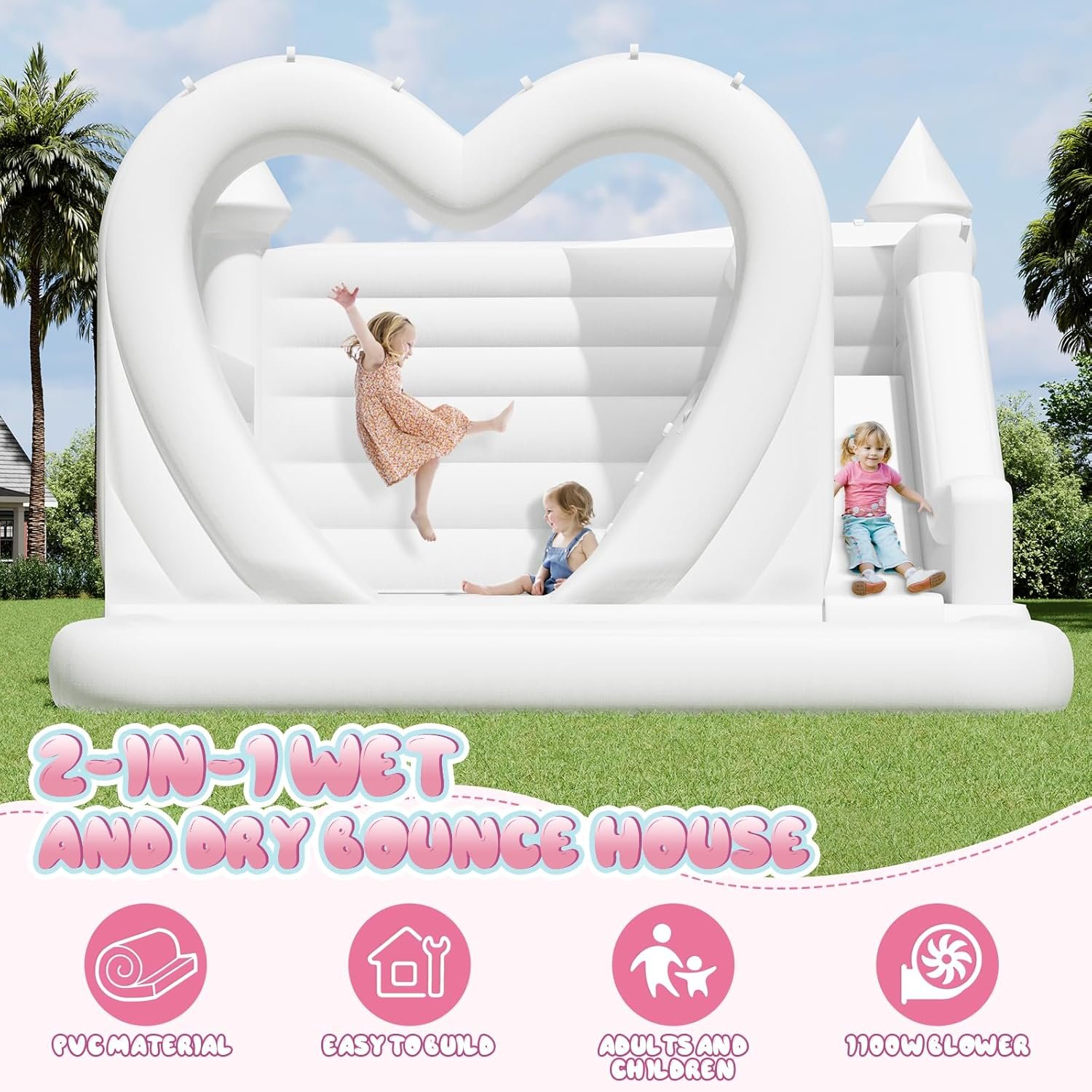 The inflatable bounce house features a 2-in-1 design for dry and wet play, complete with a slide, ball pit, and water hose attachment for outdoor fun. Its unique heart-shaped design, spacious jumping area, and fully inflatable walls ensure safety for 2-3 adults or 5-9 children. Made from durable, tear-resistant PVC, it’s easy to clean and maintain. Setup is quick—just plug it in—and repair materials are included. Minor air leakage at the seams is normal for optimal inflation. Perfect for birthday parties, holiday events, and weddings.