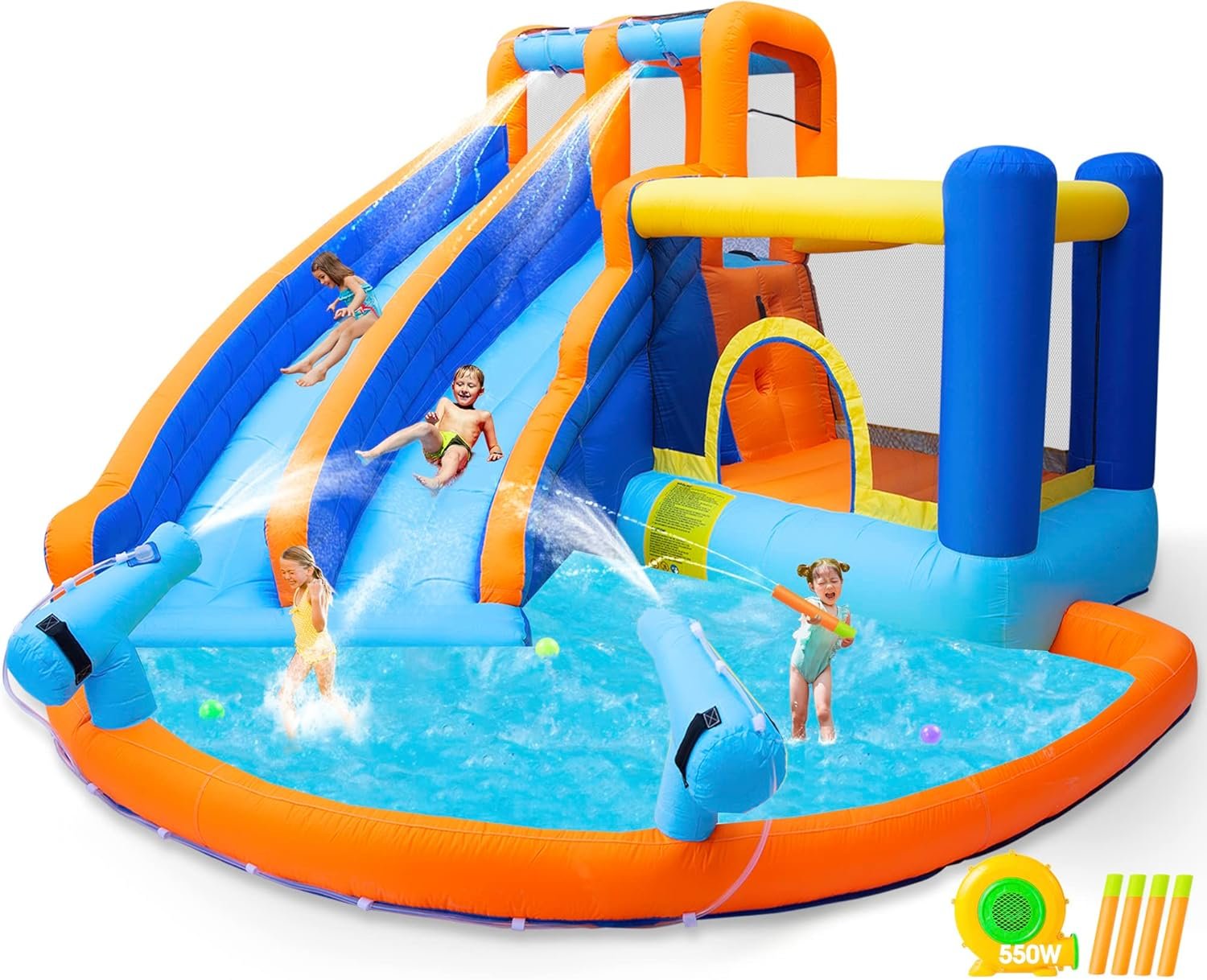 Customers find the inflatable bouncer easy to set up and enjoy playing on it for hours, with one mentioning it filled their kids’ days during summer. The product is well-sized for kids and offers good value, with one customer noting it paid for itself in two birthday parties. While the bouncer is sturdy and holds water well, some customers report issues with the material quality and water leakage through seams.