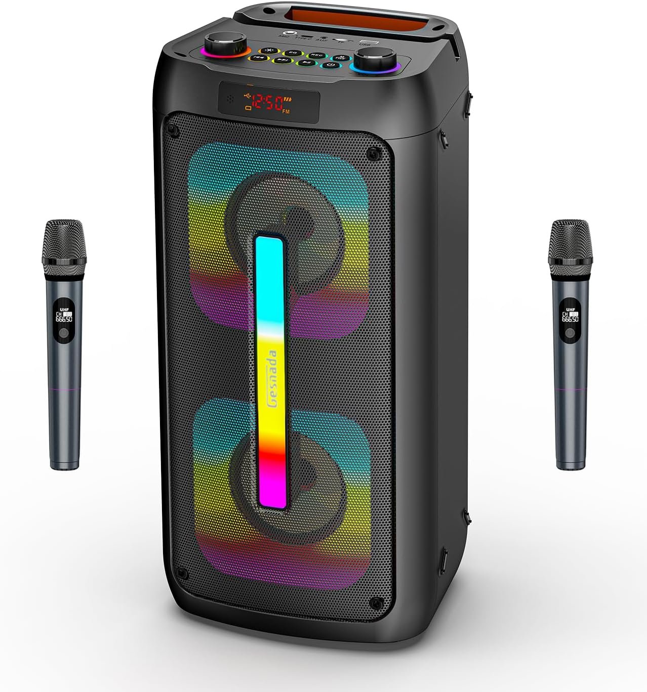 The Gesdana karaoke machine is a versatile entertainment system combining a speaker, microphone, media player, and radio, perfect for gatherings and outdoor events. Its portable design features a 4500mAh rechargeable battery for 6-8 hours of use, along with two wireless microphones. Enhanced audio drivers support TWS technology for dual-speaker systems, delivering 360-degree surround sound. Bluetooth 5.3 connectivity allows easy pairing with devices, while multiple lighting modes sync with music, enhancing the performance atmosphere. Ideal for both kids and adults, this karaoke machine is the ultimate companion for an entertaining lifestyle.
