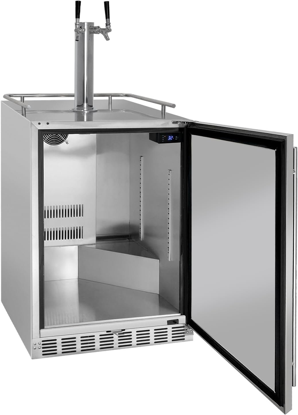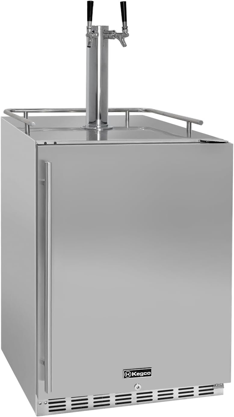 The Kegco HK38SSU-2 Digital Outdoor Undercounter Kegerator is a top-tier two-tap keg dispenser perfect for outdoor events. With a durable stainless steel exterior and versatile front-venting design, it can be used built-in or freestanding. Its powerful compressor delivers rapid cooling within a 23-59°F range, accommodating beer, coffee, kombucha, and wine. The premium kit includes a stainless steel draft tower, faucets, and a dual gauge CO2 regulator. Additionally, it features adjustable shelves for converting into a refrigerator, ensuring excellent convenience and reliability for backyard gatherings.