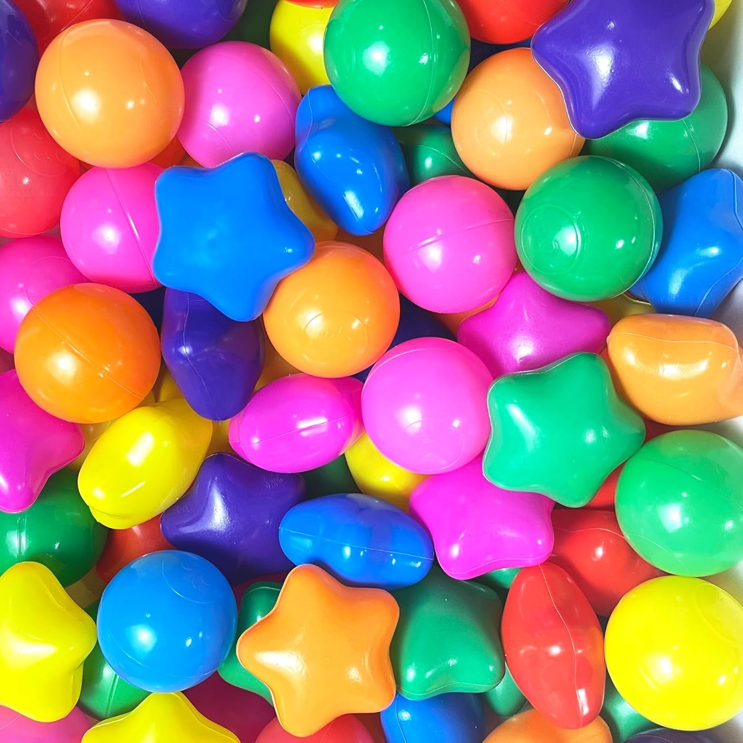 The product includes 1000 BPA-free star-shaped ball pit balls, each 2.2 inches in size. Made from food-grade, phthalate-free, and lead-free PE material, they are safe for babies. The colorful balls come in seven shades, encouraging color recognition. Ideal for ball pits, play areas, and play pools, they provide endless fun while allowing parents to relax. The balls are soft, odorless, and non-toxic. An after-sales service is available, promising responses to inquiries within 12 hours.