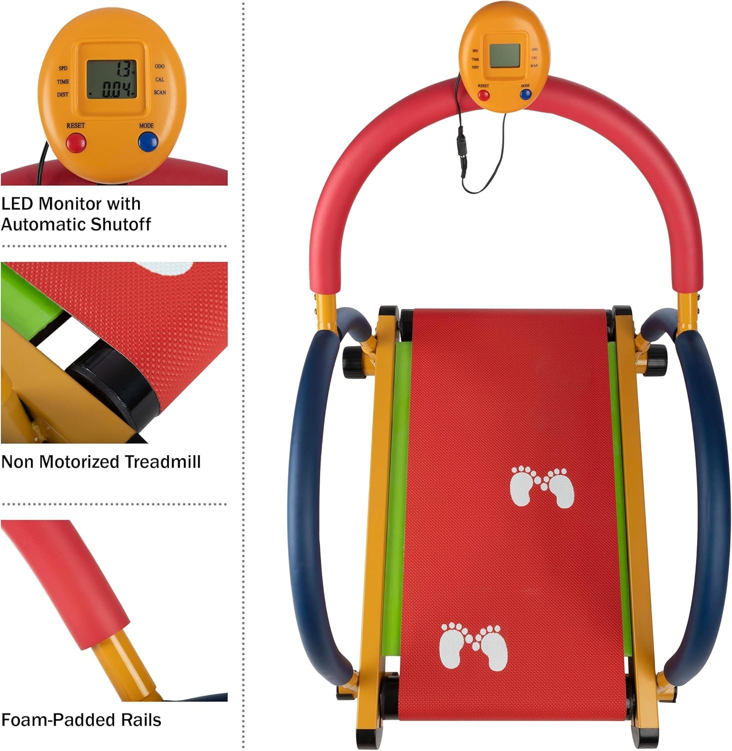 The Kid Treadmill is a colorful, manual exercise device designed for children aged 3-7, promoting physical activity indoors regardless of weather. It features safe construction with foam-padded rails and a lively footprint design, making exercise fun. An LED monitor tracks activity time and shuts off after 10 minutes of inactivity. Built from durable alloy steel, it supports kids up to 150 pounds. Dimensions are 20.25”L x 27” W x 20.5”H. Ideal for fostering healthy habits, this sturdy treadmill encourages active play during rainy days and requires 2 AA batteries for the display (not included).