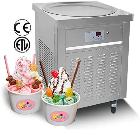 The Kolice Roll Ice Cream Machine features an ETL certificate and meets UL NSF testing standards. Operating at 110V, 60HZ, and 900W, it has a maximum temperature of -30C (-22F) and is made from food-grade stainless steel. It includes a 55cm (22 inches) ice pan, a Smart AI temperature controller, and an easy-to-clean tilted edge. With dimensions of 23.62”x23.62”x34.05” and a weight of 132 lbs, it comes with two stainless steel spatulas and a user manual. Suitable for ice cream shops, bars, cafes, and more, it is packaged in a plywood case.