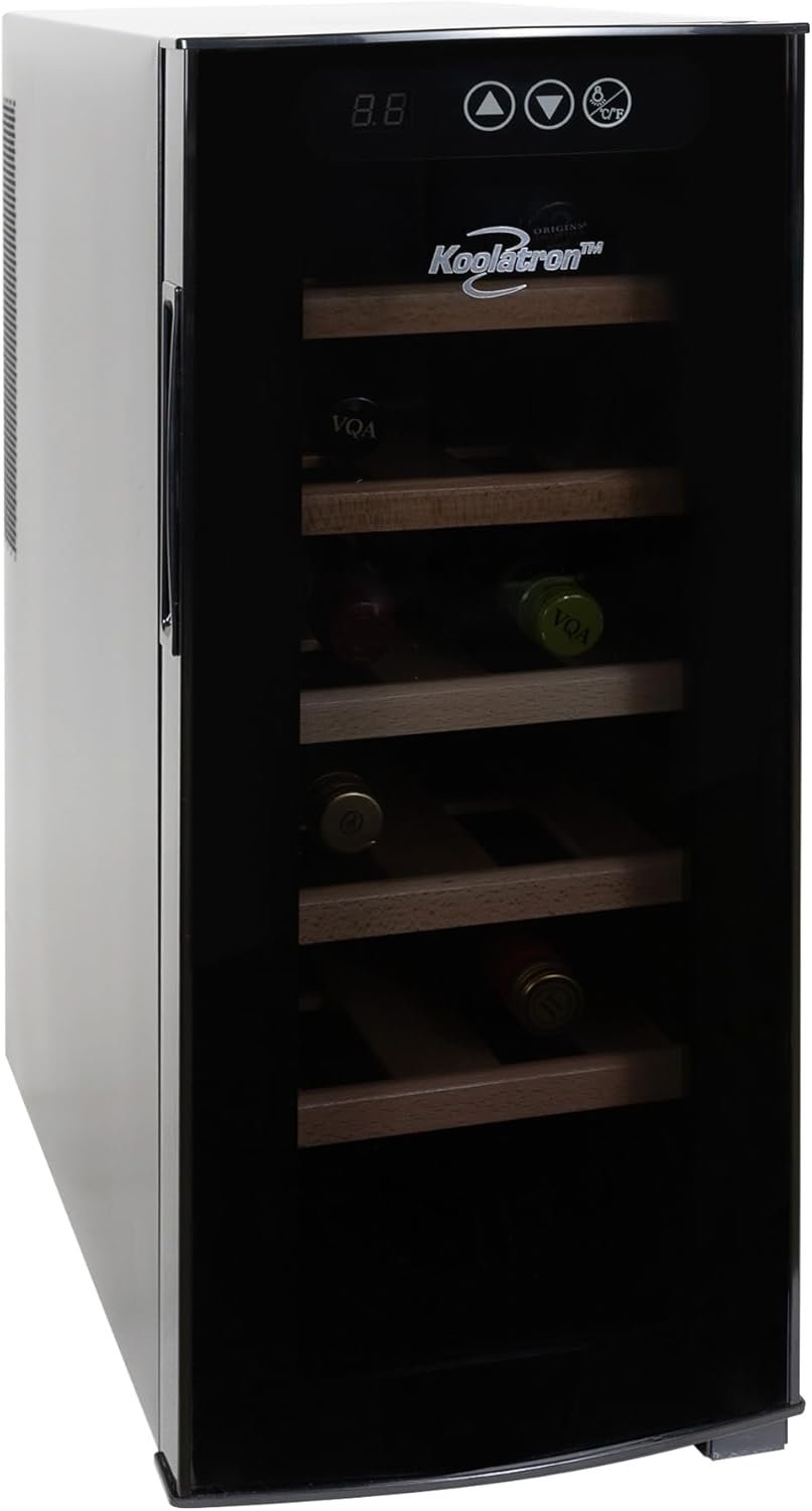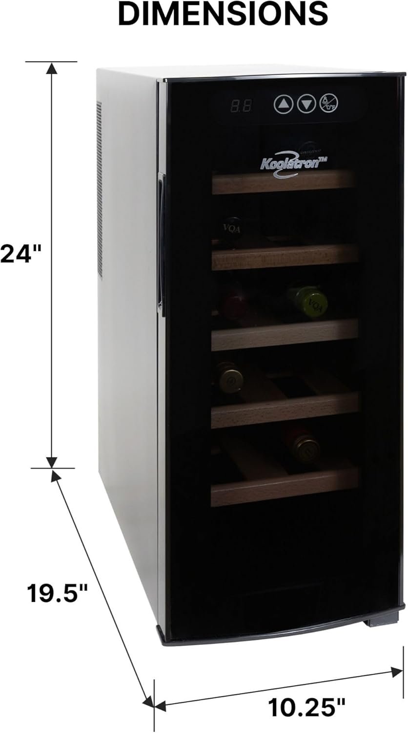 The Koolatron 12 Bottle Deluxe Wine Cellar features double tempered glass doors, wooden shelves, and soft lighting. Its thermoelectric cooling ensures no vibration disrupts wine sediment, with digital controls to maintain temperatures between 46-66°F (8-18°C). The stylish design complements any decor, while removable shelves offer flexible storage options. It’s compact, freestanding, and operates quietly, suitable for various spaces. Additionally, the UV-protective glass door preserves wine quality, making it a practical choice for enthusiasts. The wine cooler comes with a one-year warranty for added assurance of quality.