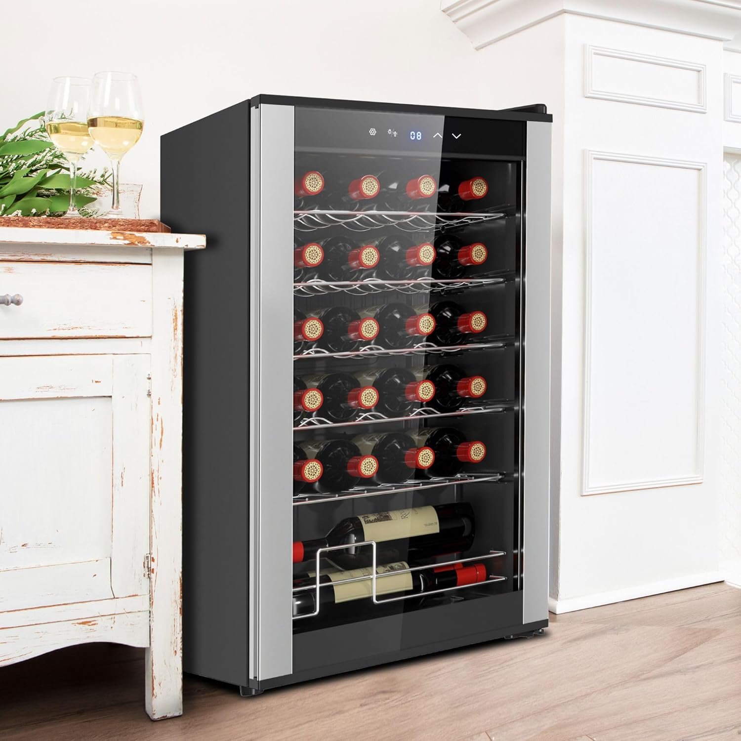 The Koolatron 24 Bottle Compressor Wine Cooler offers a temperature-controlled environment (41-64°F) to preserve the flavor and aroma of wines. With a capacity for 24 standard Bordeaux bottles, it features adjustable stainless steel racks, touch controls, and a high-performance, low-vibration cooling system. The unit has a tempered smoked glass door for UV protection, ensuring long-term storage integrity while adding aesthetic appeal. Automatic defrost and energy-efficient LED lighting enhance functionality. Freestanding and compact, it’s a versatile choice for any wine enthusiast looking to showcase and store their collection effectively.