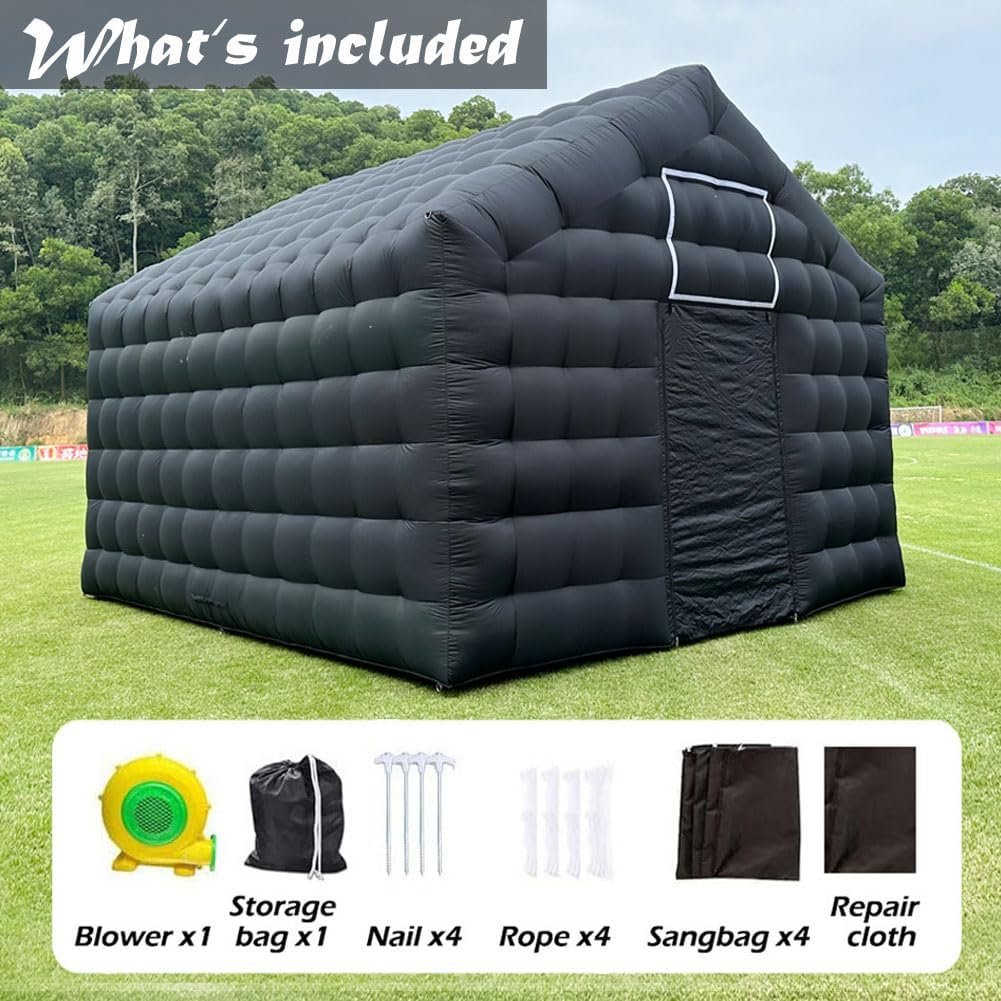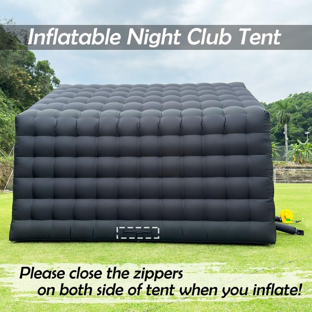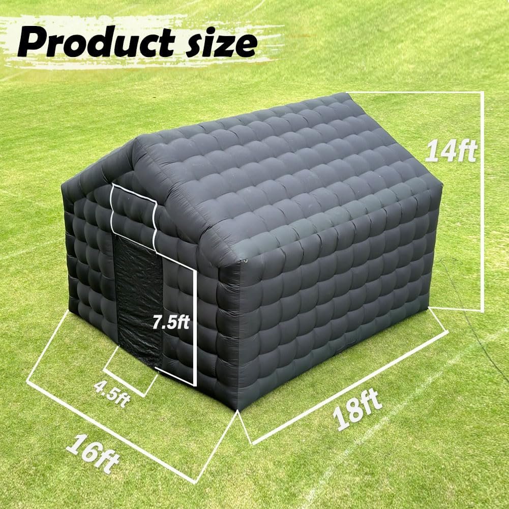 The Inflatable Disco Party Tent is made from lightweight and durable 210D Oxford cloth, measuring 18ft x 16ft x 14ft and accommodating 15-20 people. It inflates in 3-5 minutes with a 750W air blower and includes accessories like ground nails, ropes, and a storage bag. Designed for various events such as weddings, festivals, and exhibitions, it features a customizable Velcro area for logos. The tent can be easily stored after use by opening the zippers to deflate it. Lights are not included.