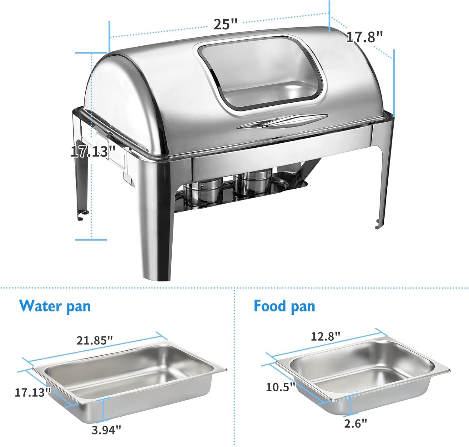 The Visual Buffet Stove Set is a large, stylish buffet warmer made of food-grade stainless steel, ideal for parties, gatherings, and events. It can keep food warm with a fuel rack and hot water, accommodating up to 9 quarts with two half-size food pans. The clear lid allows easy viewing of contents without needing to open it. Suitable for various occasions, this buffet stove enhances group dining experiences, making it a versatile choice for outdoor parties, weddings, and family events. Durable and safe, it is designed for long-term use and satisfaction.