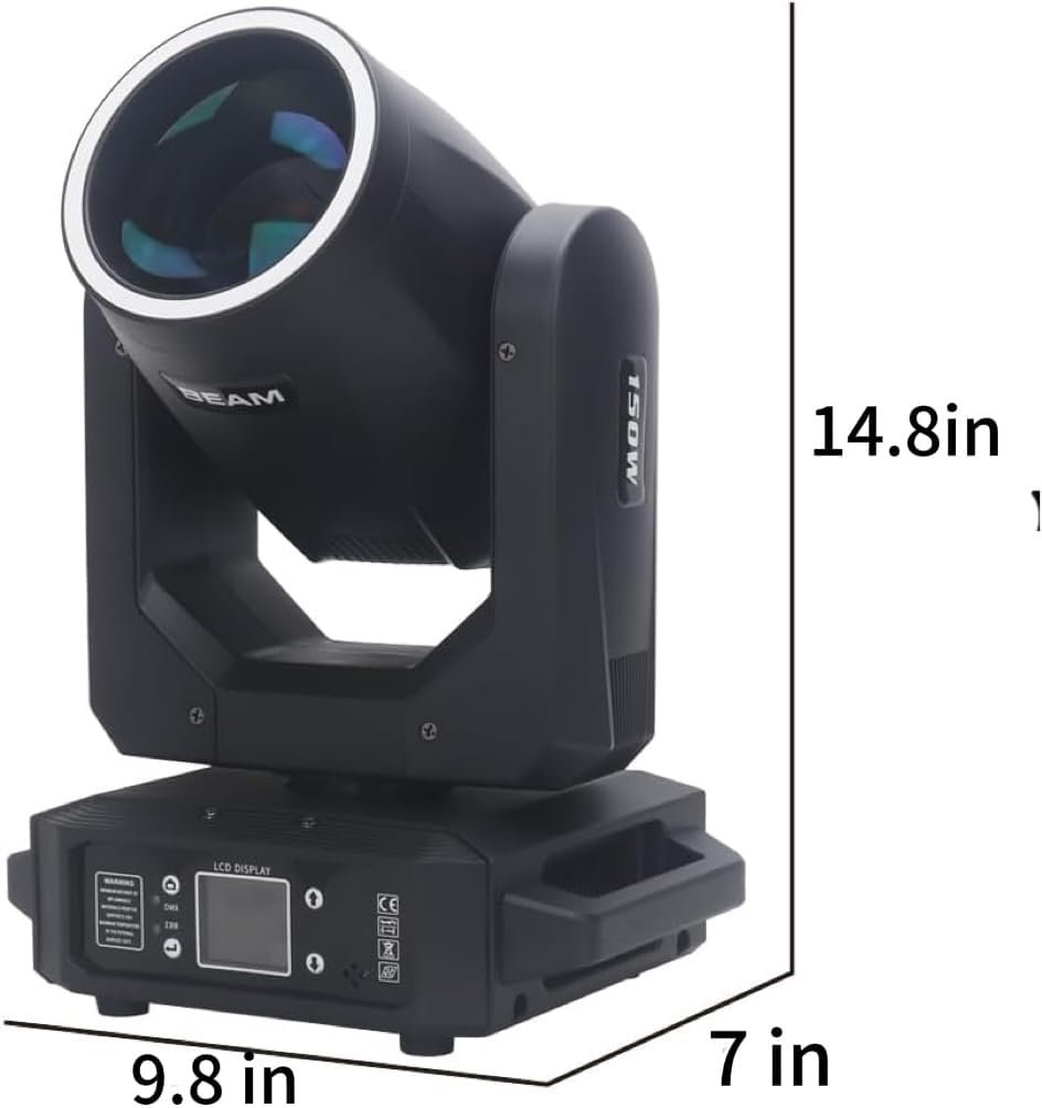 The 150W Beam Moving Head DJ Lamp features a color palette of 7 colors plus white, 11 patterns, and 18 prism effects. It operates at AC100-240V, consuming 200W, with a lifespan of over 20,000 hours. The lamp allows manual focusing, linear dimming (0-100%), and adjustable strobe speed (1-20Hz). Control options include DMX, remote, and voice control. Compact and lightweight, its dimensions are 14.8 x 9.8 x 7 inches, weighing 13 lbs. Suitable for events like disco parties and concerts, it has garnered positive reviews with a rating of 4.4 out of 5 stars.