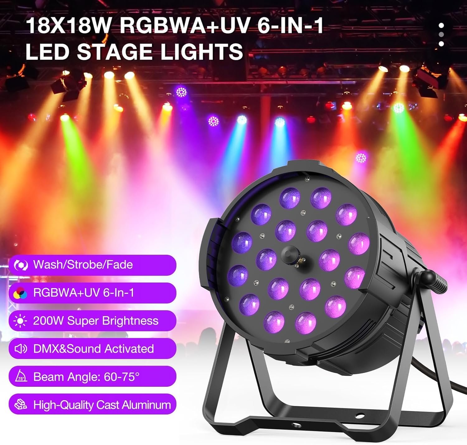 The HOLDLAMP DJ light features a compact design (9.06 x 9.06 x 11.81 inches, 7.28 pounds) with zoomable functionality (60-75 degrees) and multiple modes, including color mixing and sound control. This 18X18W DMX RGBW light offers vibrant colors and adjustable brightness, suitable for various events like parties and concerts. Made from durable metal, it includes user-friendly instructions and supports flexible installation options. First available on November 17, 2023, this high-quality stage light combines robustness and versatile lighting effects, ensuring an enhanced experience for all occasions.